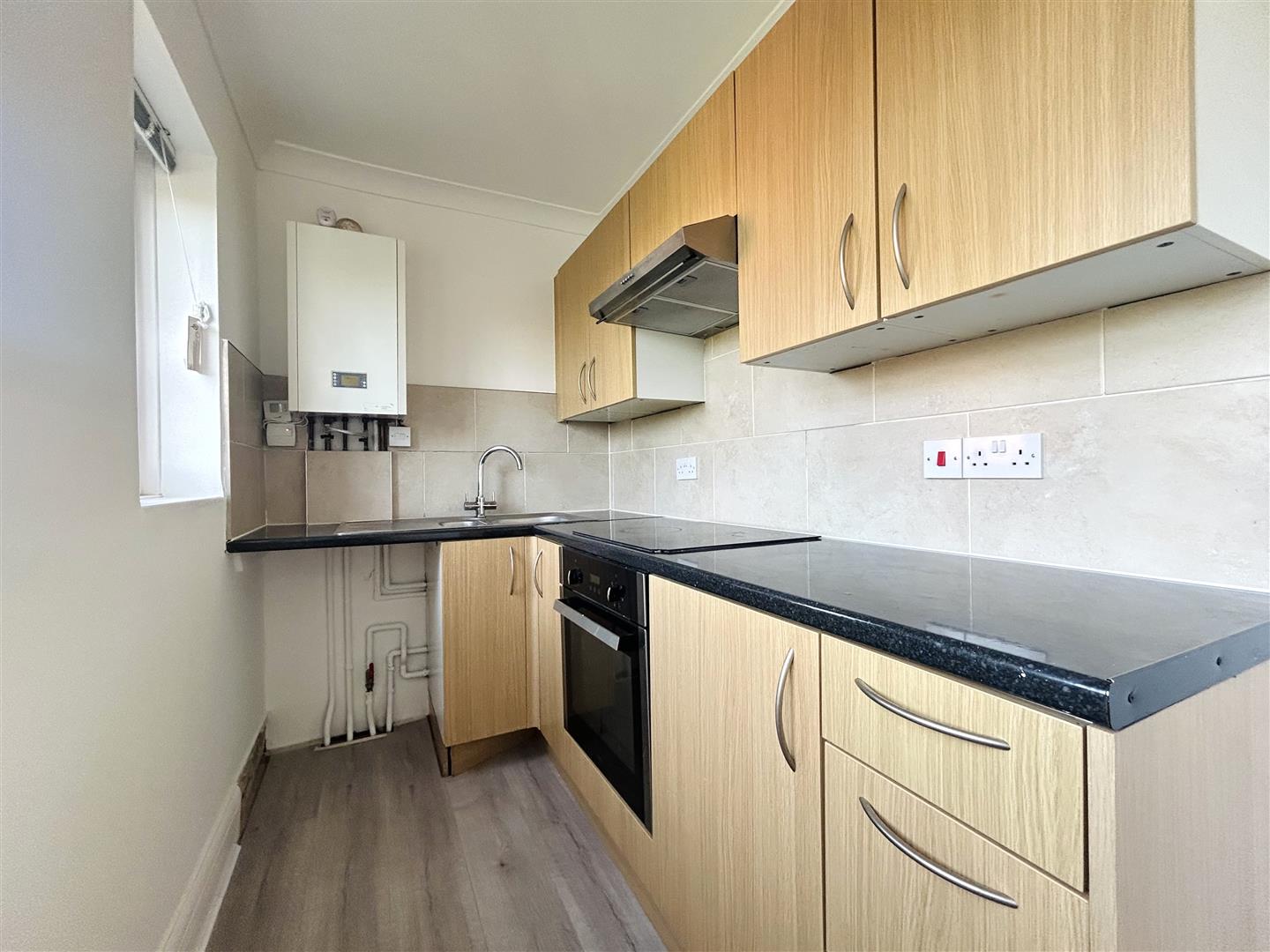 Fitted kitchen suite comprising; Laminated rolled edge work surfaced with inset one and a half bowl single drainer stainless steel sink unit with stainless steel mixer tap. Inset four ring electric hob with oven under and extractor hood above. Space for fridge freezer. Space & plumbing facilities for washing machine. Selection of matching wall units with cupboards & drawers at both eye and floor level. Wall mounted gas combination boiler. Tiled splash backs. Two double glazed windows to rear.
