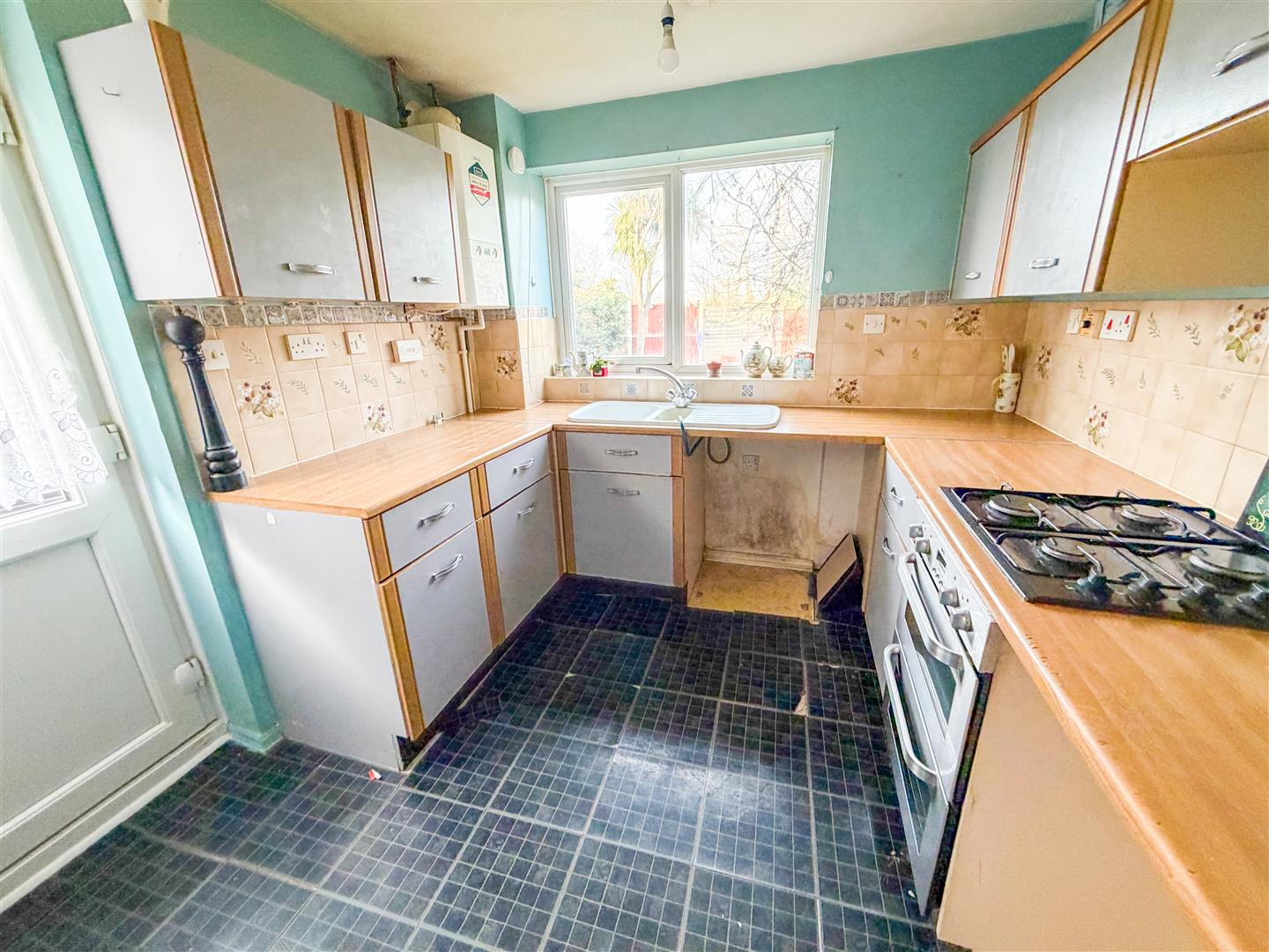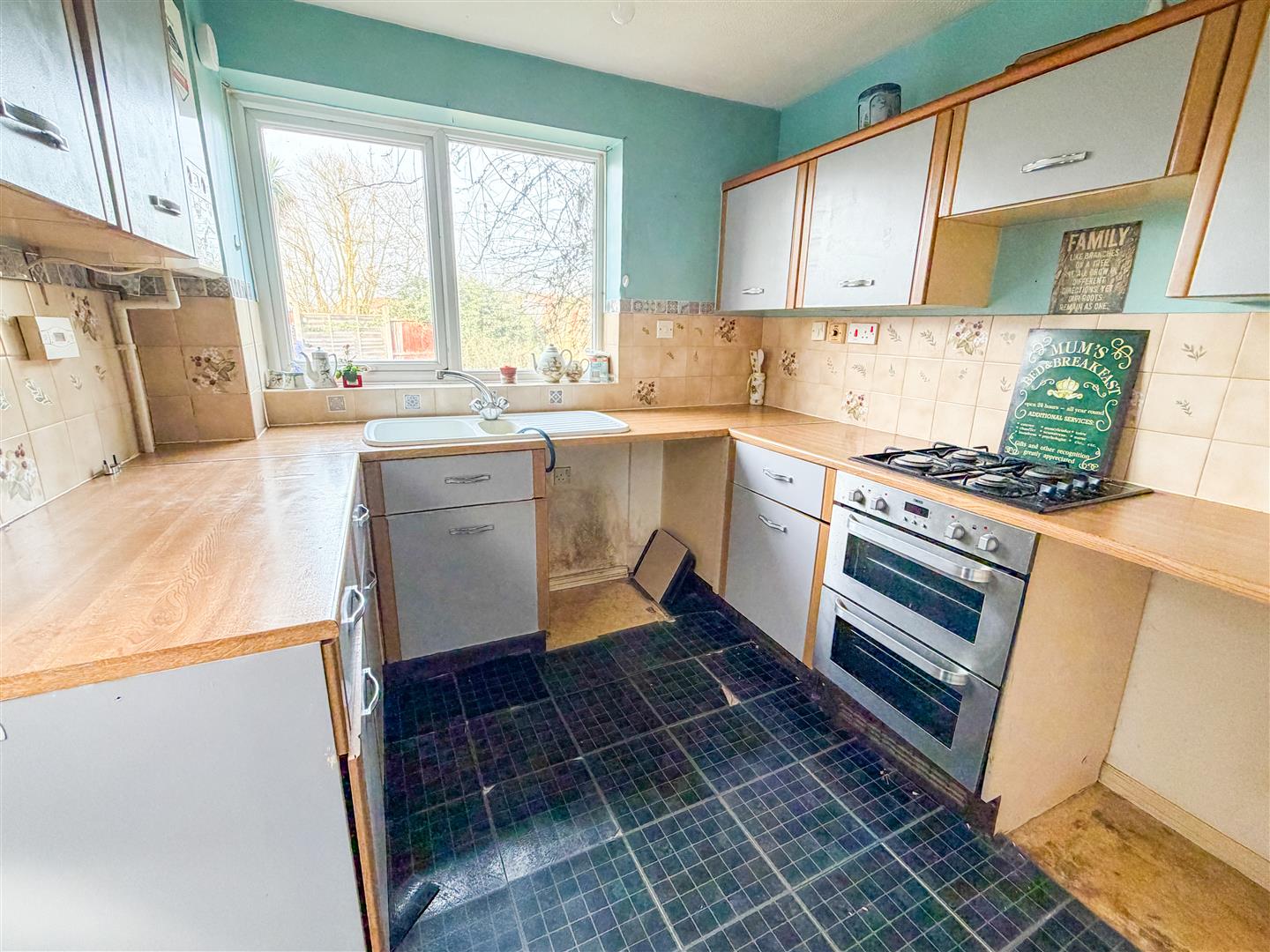 Fitted with a range of laminate fronted units with a wood veneer trim. Wood effect laminated rolled edge work surfaces with cupboards and drawers below. Range of matching wall mounted units. Inset single drainer sink unit with mixer tap. Range of matching wall mounted units. Inset four ring gas hob with under counter double oven (appliances not tested). Space and pliumbing for washing machine. Under counter fridge space. Under stairs storage cupboard. Tiled splash backs. Double glazed window to rear overlooking garden. Double glazed door to side.