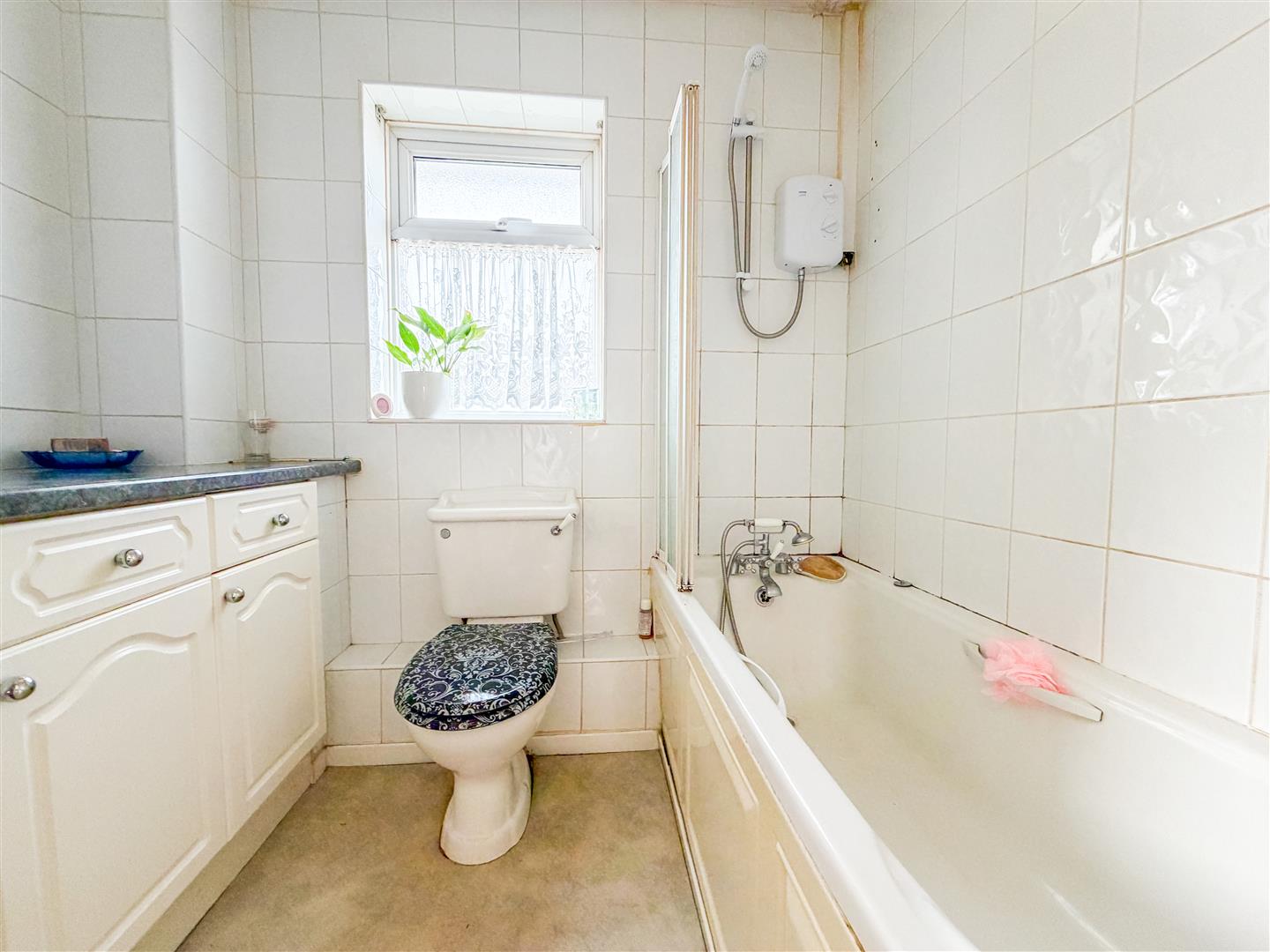 Fitted with a three piece white suite. Comprises panel bath with mixer tap and shower attachment. Additional electric shower over (not tested). Folding shower screen. Low level W.C. Vanity wash hand basin with cupboards below. Fully tiled walls. Radiator. Double glazed window to rear.