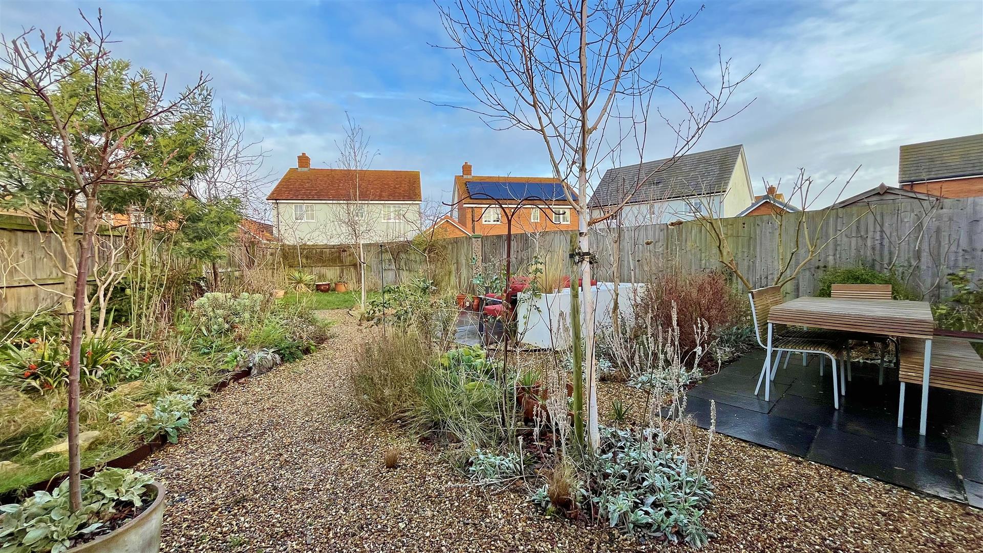 Part paved area. Remainder laid to lawn. Beds stocked with shingle and an array of trees. L-shaped planter for seating area. Shed to remain. Outside lights. Access to front via side gate. Enclosed by panelled fencing.
