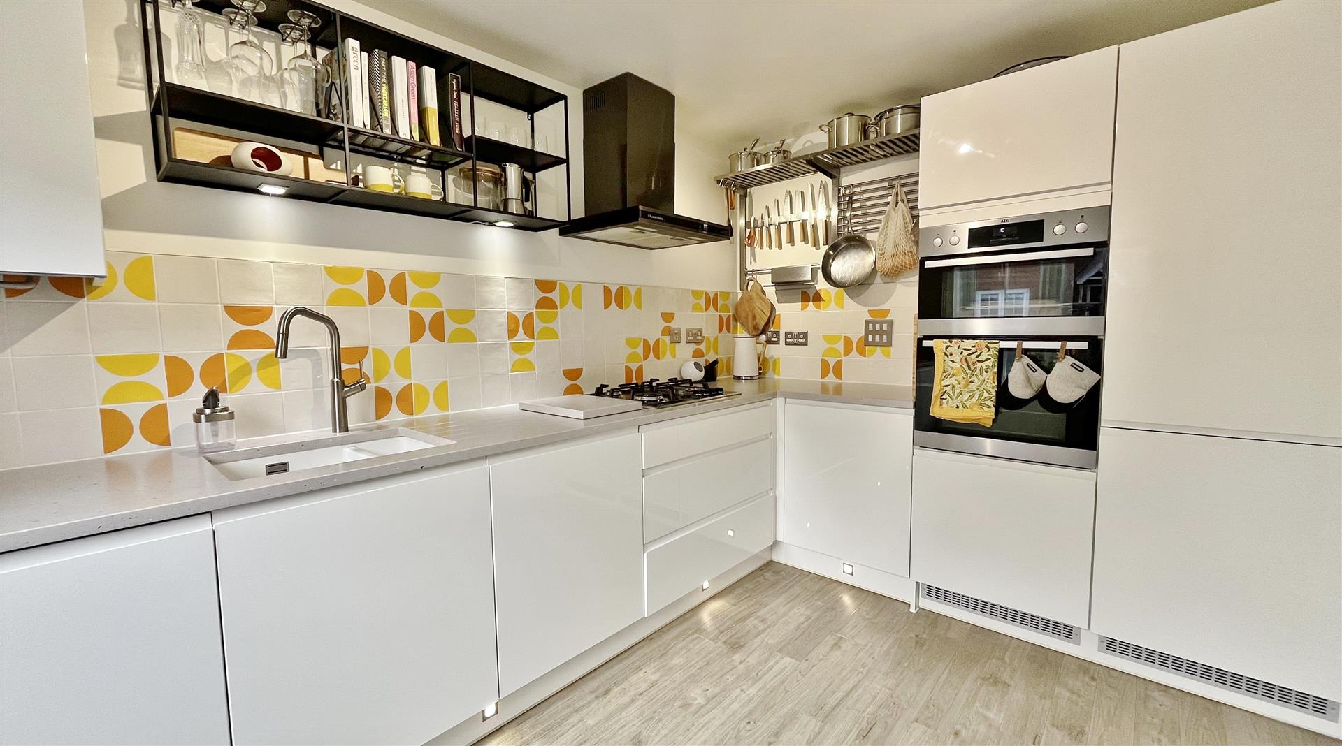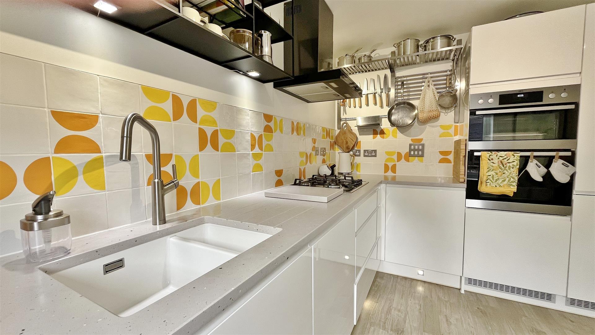 Fitted in a range of high gloss matching fronted units. Pencil edge Silestone engineered quartz worktop with drainer grooves. Inset ceramic one and a half sink bowl. Inset four ring gas hob with extractor fan above. Built in eye level electric grill and oven. Further range of matching fronted units both eye and floor level. Integrated fridge/freezer, washing machine and dishwasher. Cupboard housing combination boiler providing hot water and heating throughout. Tiled splash back. Amtico flooring. Sealed unit double glazed window to front.