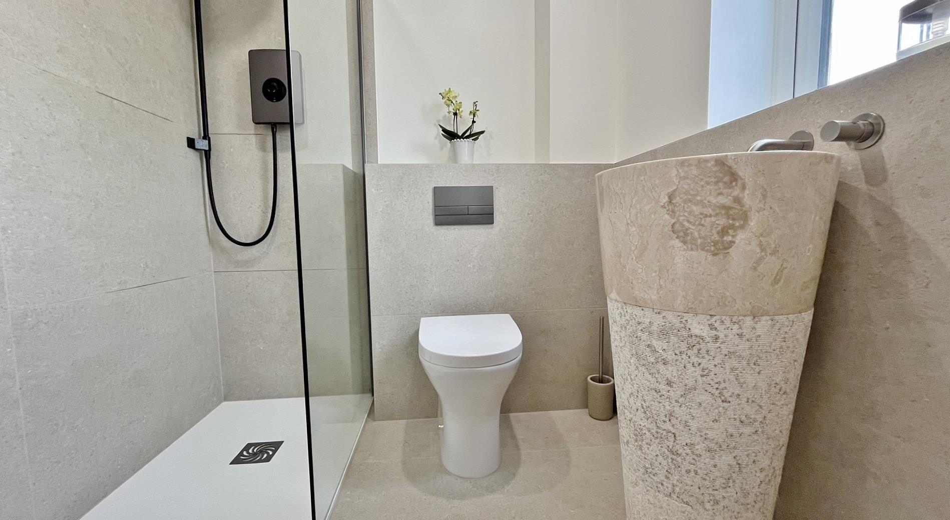 Modern suite comprises of low level w/c with concealed cistern and flush plate. Freestanding cream marble pedestal basin with a wall-mounted tap. Fitted walk-in frameless glass shower cubicle with a wall-mounted rainfall shower attachment. Heated towel rail. Extractor fan. Spotlights. Large stone effect porcelain wall and floor tiles. Obscured sealed unit double glazed window to front.