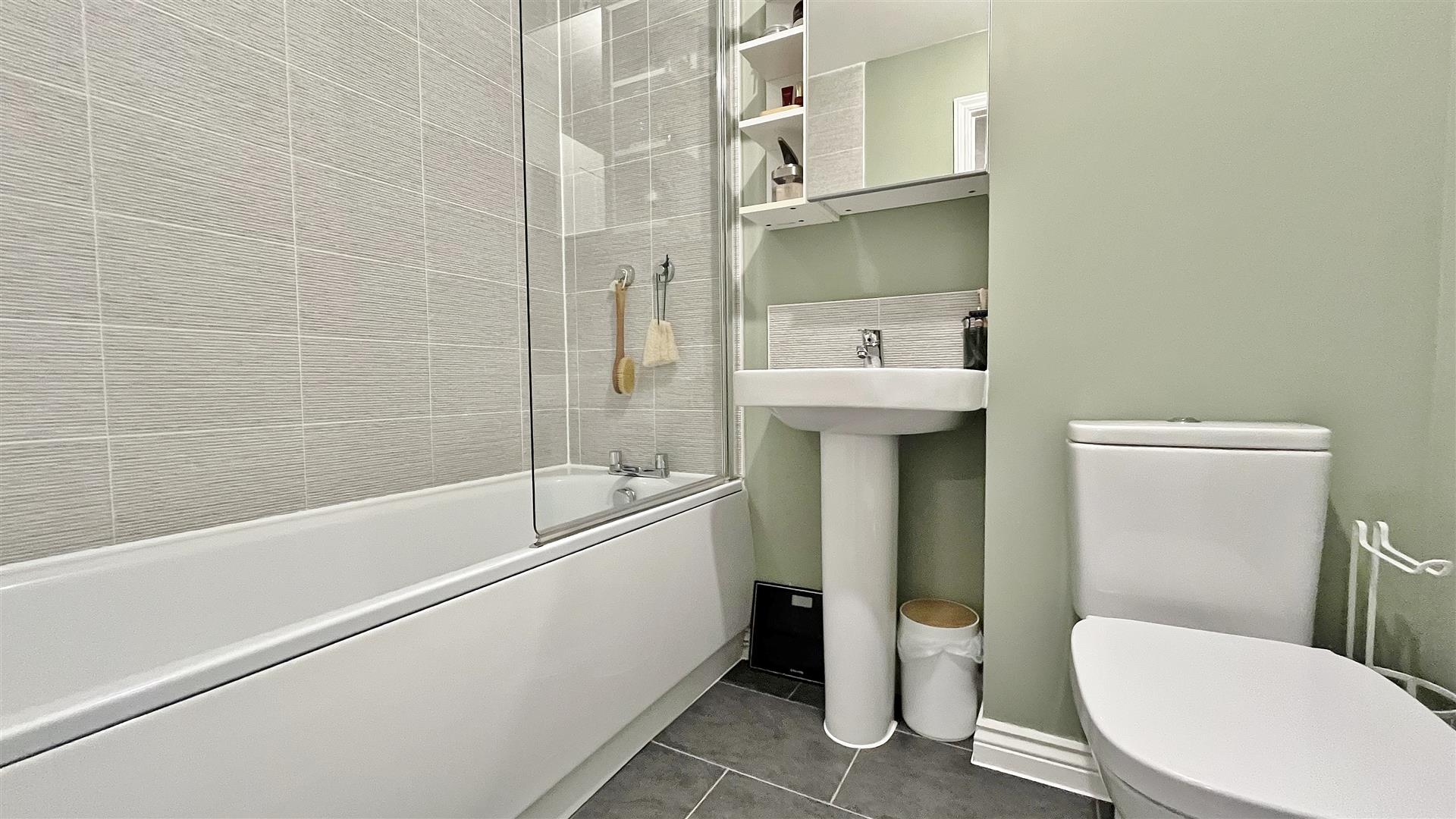 White suite comprises of low level w/c. Pedestal hand wash basin. Fitted panelled bath. Vinyl flooring. Stone effect part tiled walls. Heated towel rail. Extractor fan.