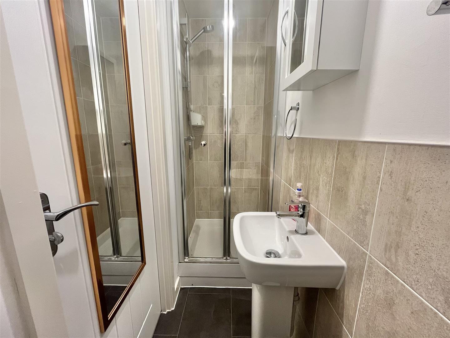 Three piece suite comprising low level W.C. Pedestal wash hand sink basin. Step in shower cubicle with wall mounted electric shower (not tested). Radiator.
