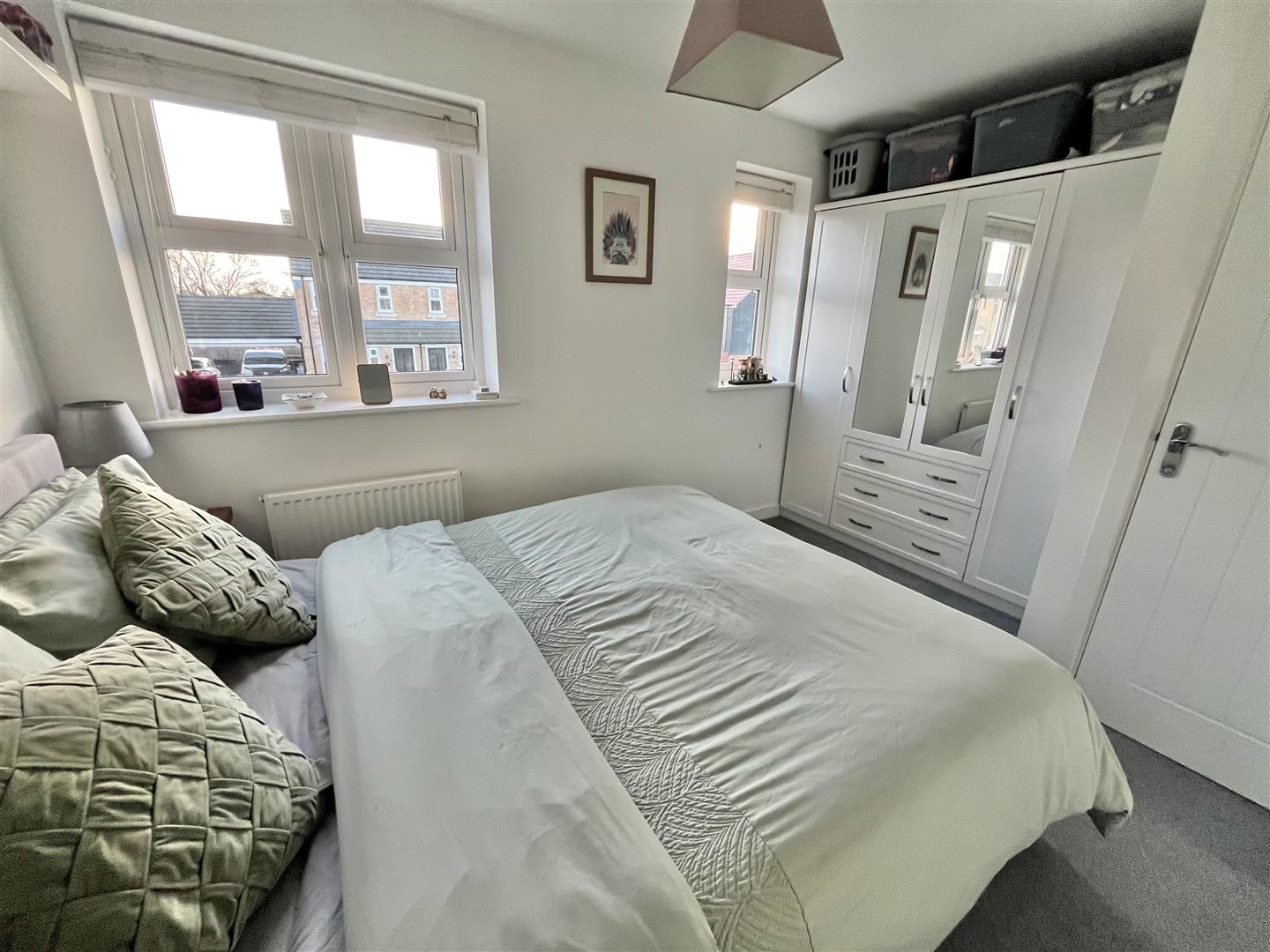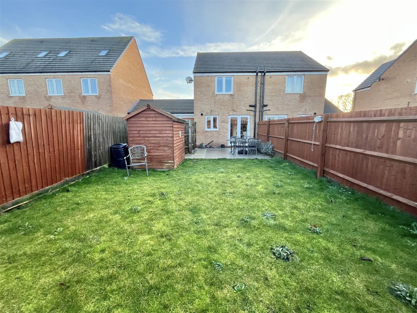 Partly paved patio area with the remainder being laid to lawn. Storage shed. Side access to front.