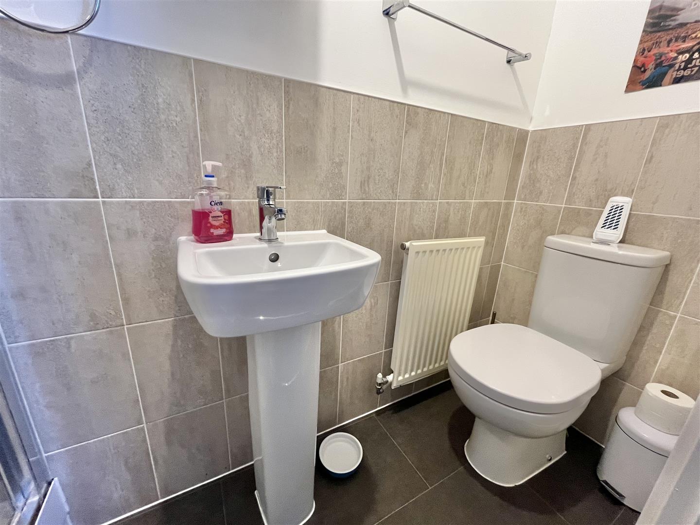 Low level W.C. Pedestal hand wash sink basin. Radiator. Double glazed window to front.