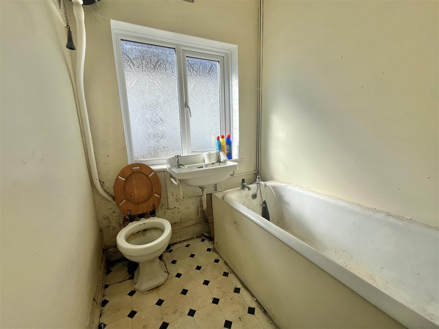 Three piece suite comprising High level W.C. Wash hand sink basin. Panelled bath. Loft access. Double glazed window to side.