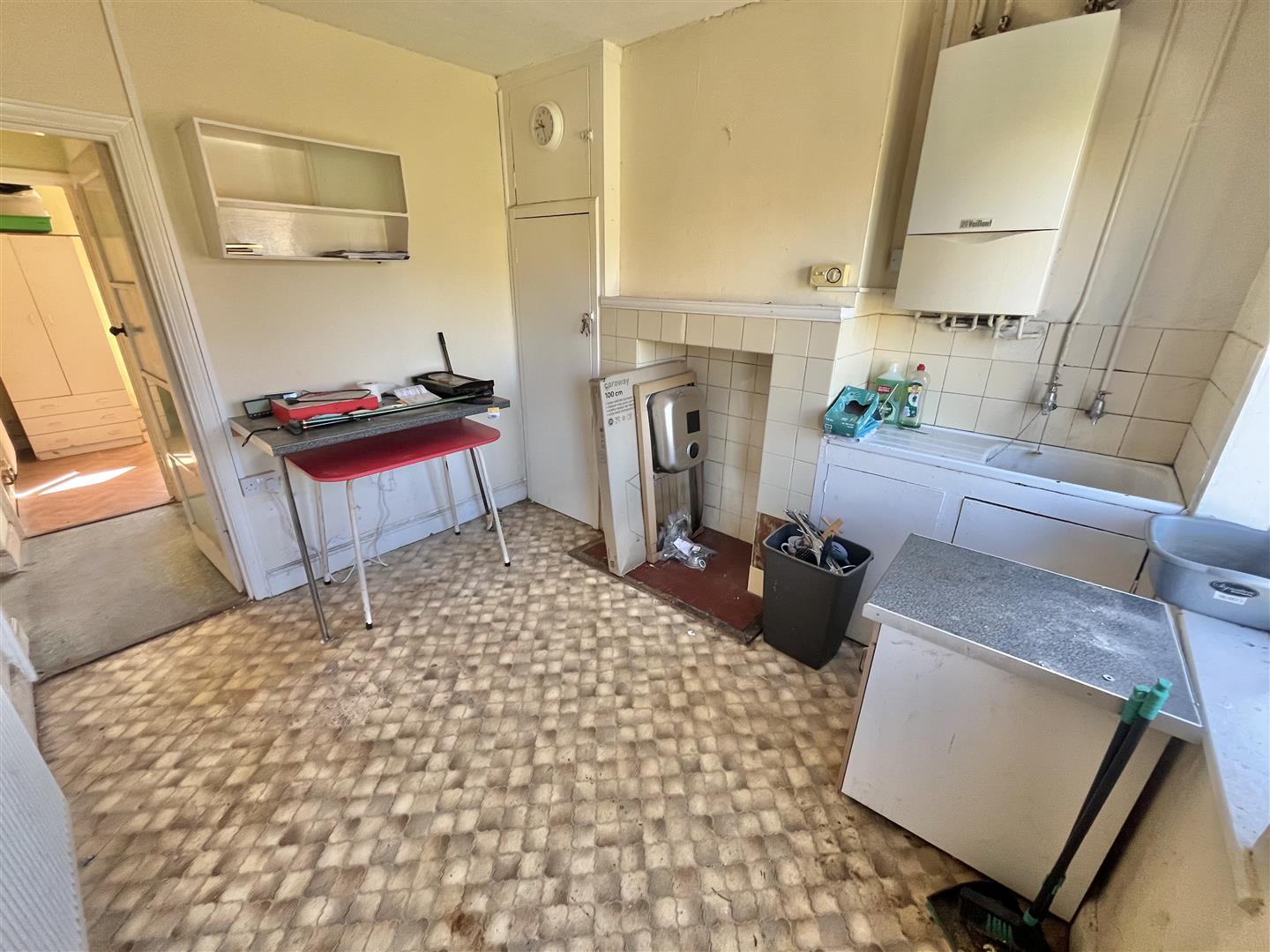 Single drainer sink unit. Gas combination boiler. (All appliances not tested). Marble effect square edge work surfaces. Storage cupboard. Double glazed window to rear. Radiator. Double glazed door to garden.