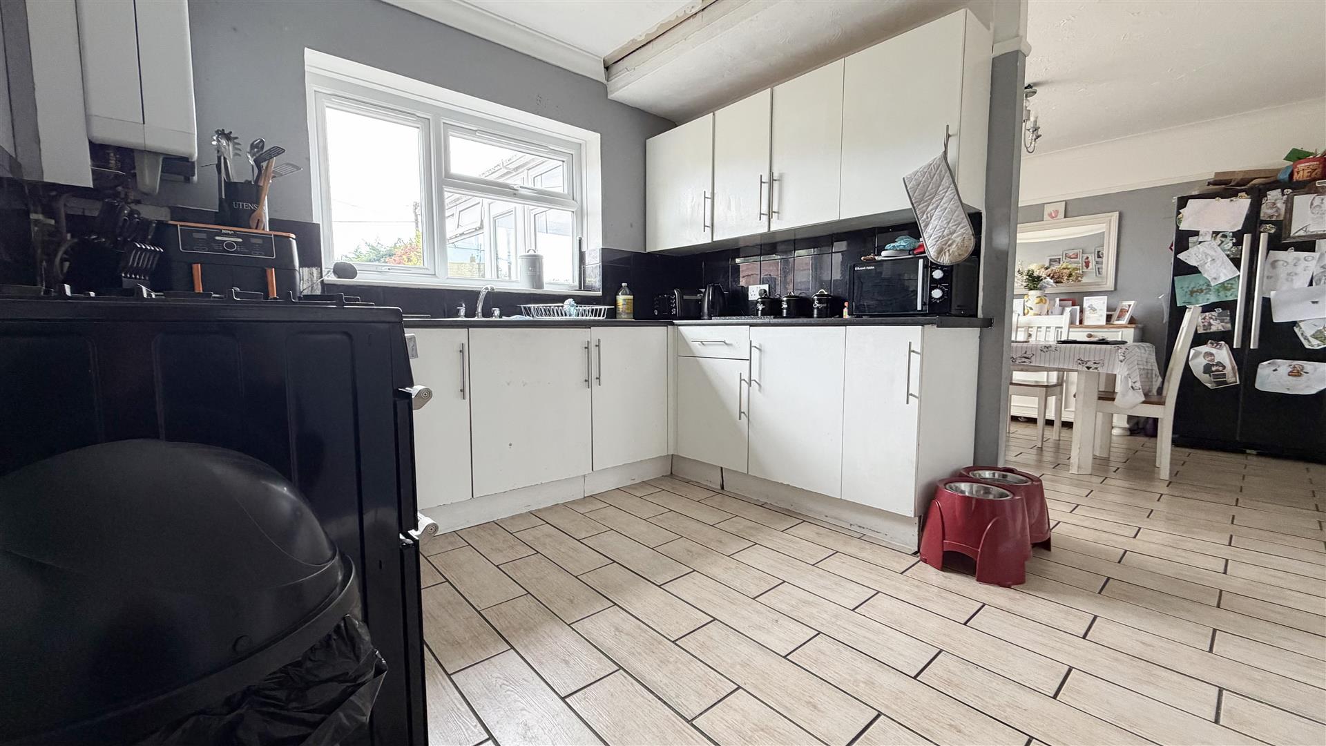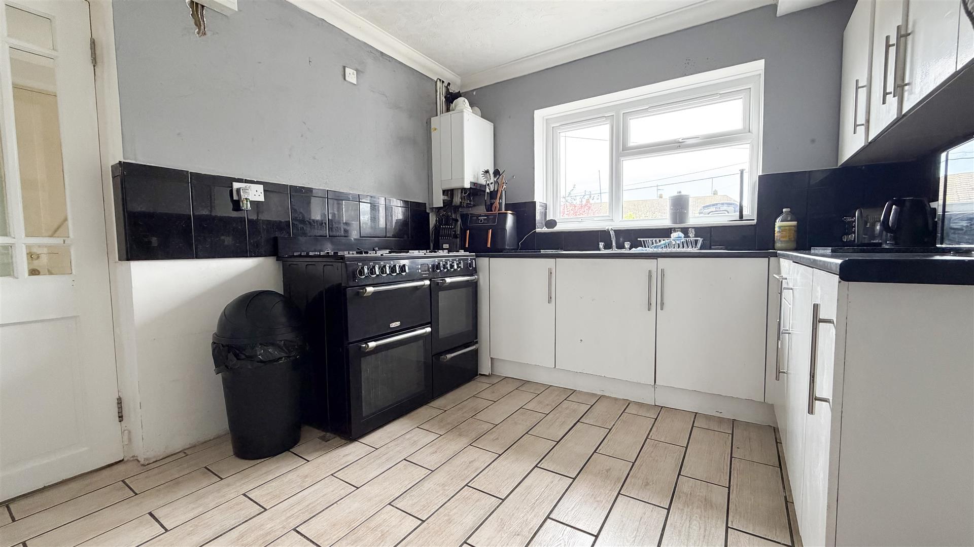 Fitted with a range of white fronted units at both eye and floor level. Laminated square edge work surfaces. Inset stainless steel single drainer sink unit. Space for range cooker. Space for fridge/freezer. Wall mounted boiler serving hot water and heating. Double glazed window to rear. Open access to: