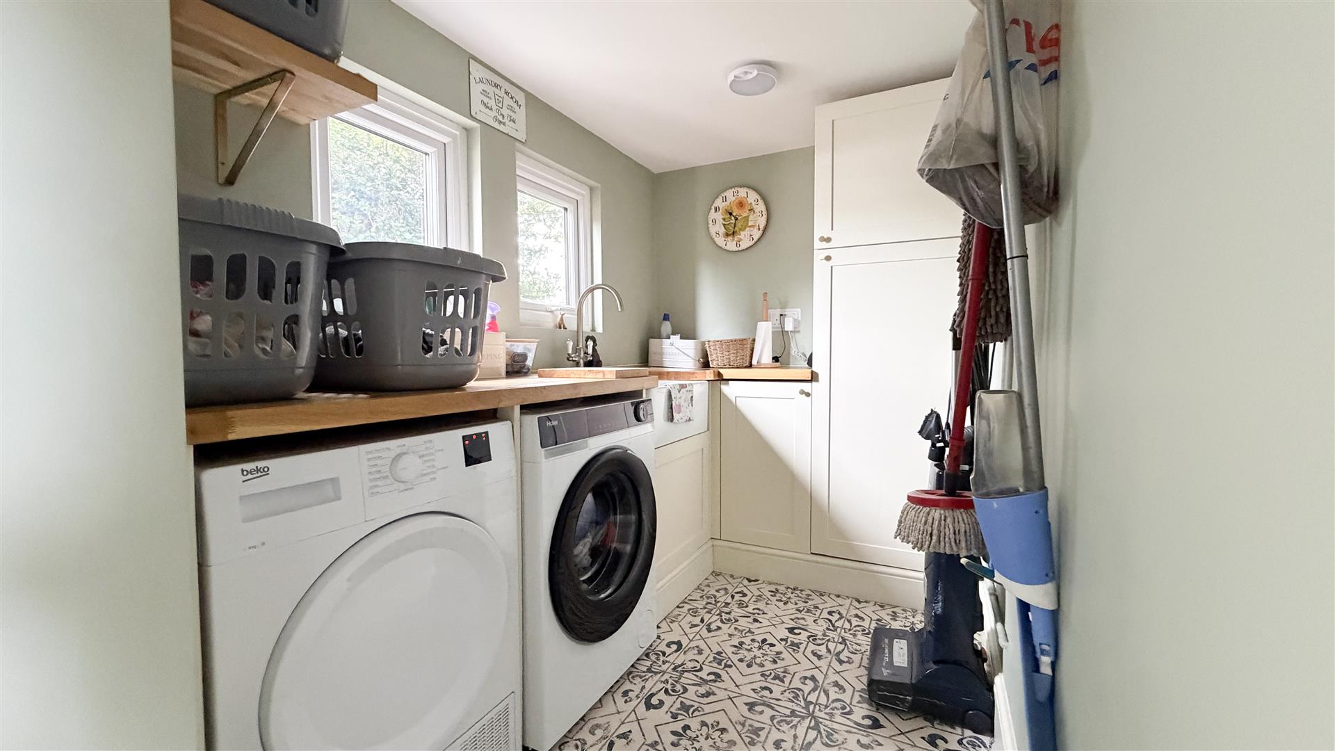 Wooden work surface with inset 'Butler' sink. Plumbing and space for washing machine and tumble dryer. Two double glazed windows.