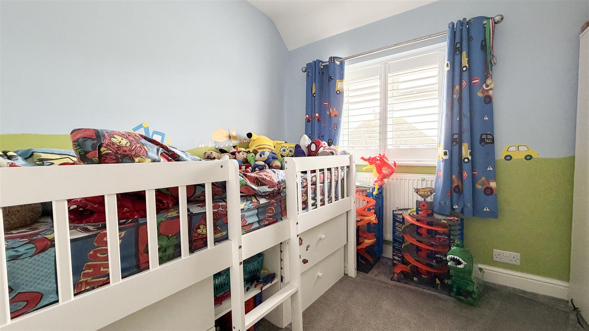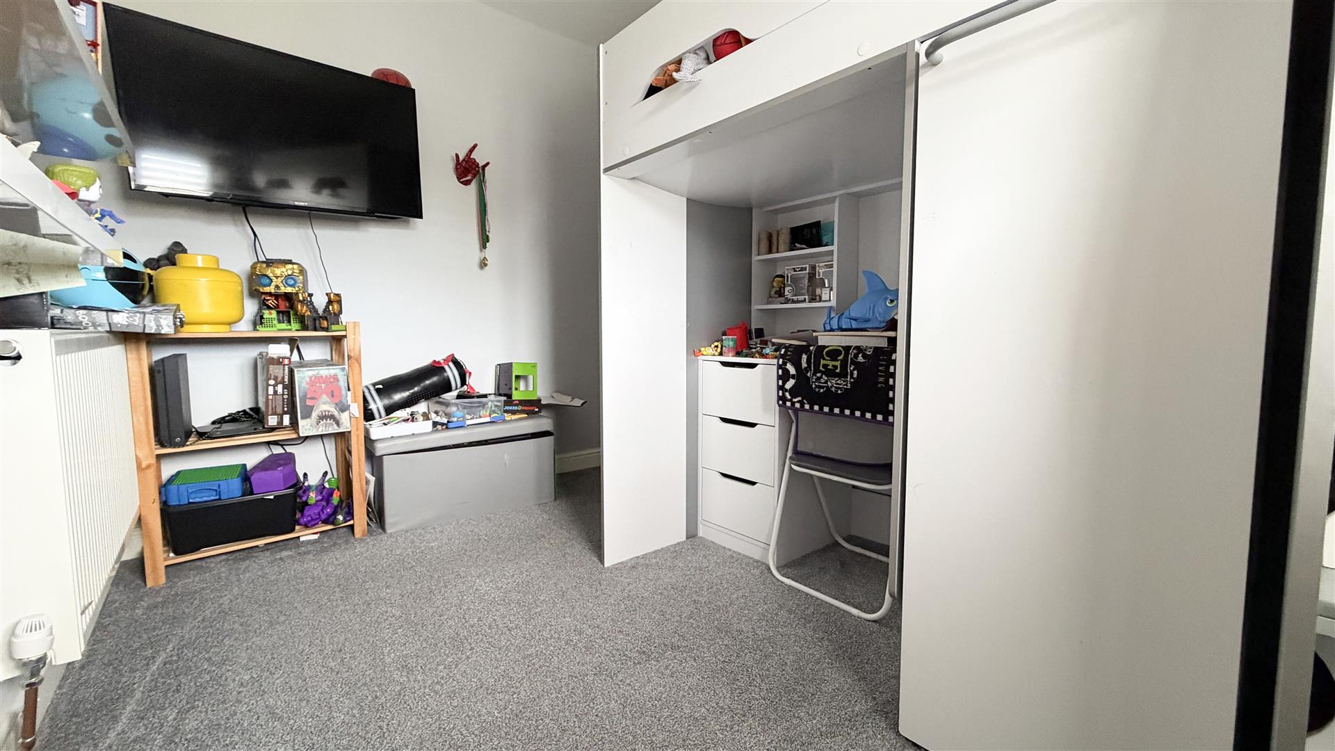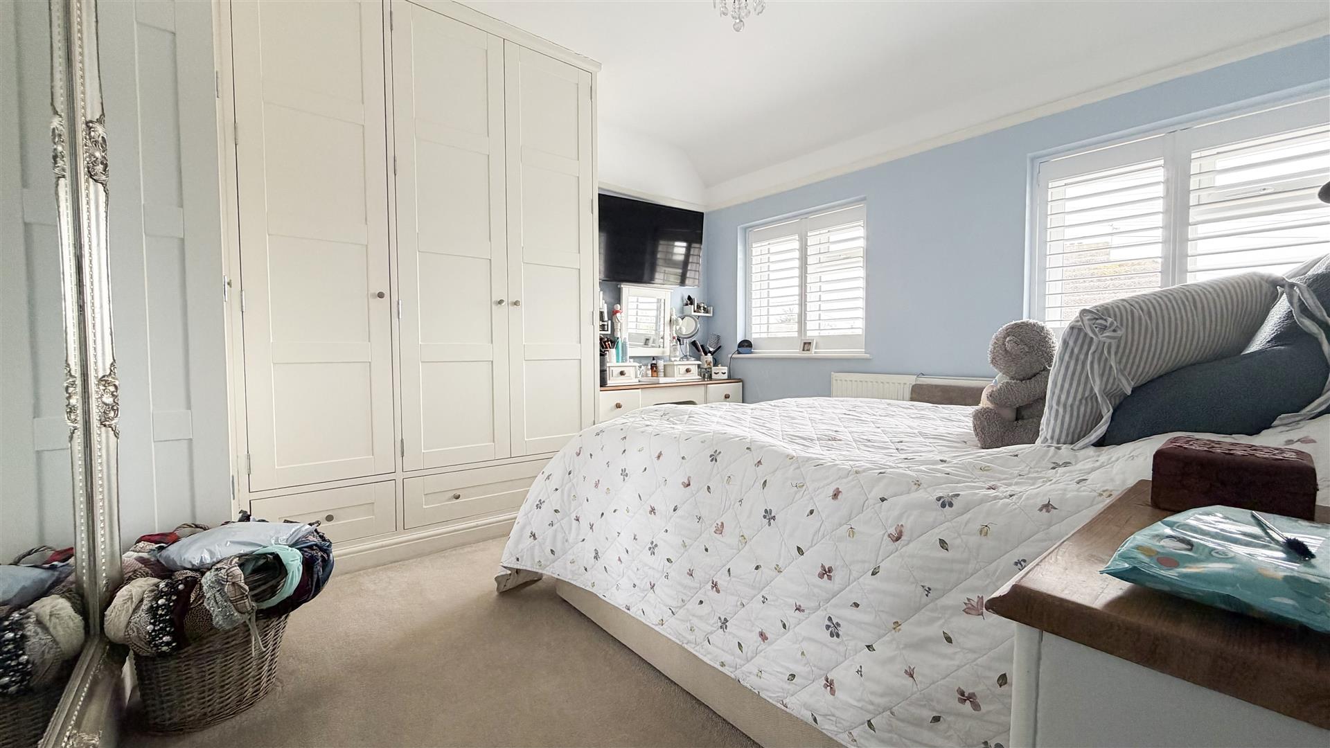 Radiator. Fitted wardrobes. Two double glazed windows to front.