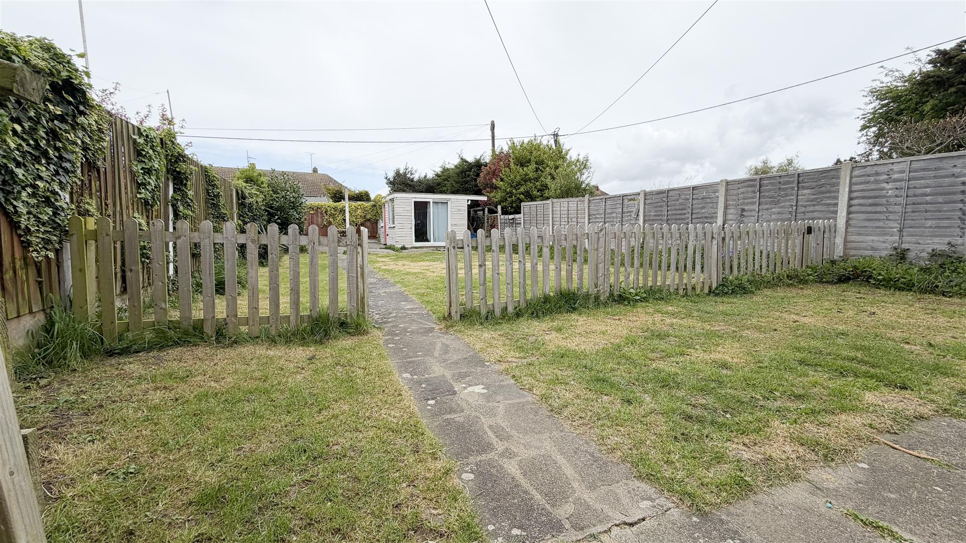 Paved patio area. Remainder laid to lawn. Storage shed.