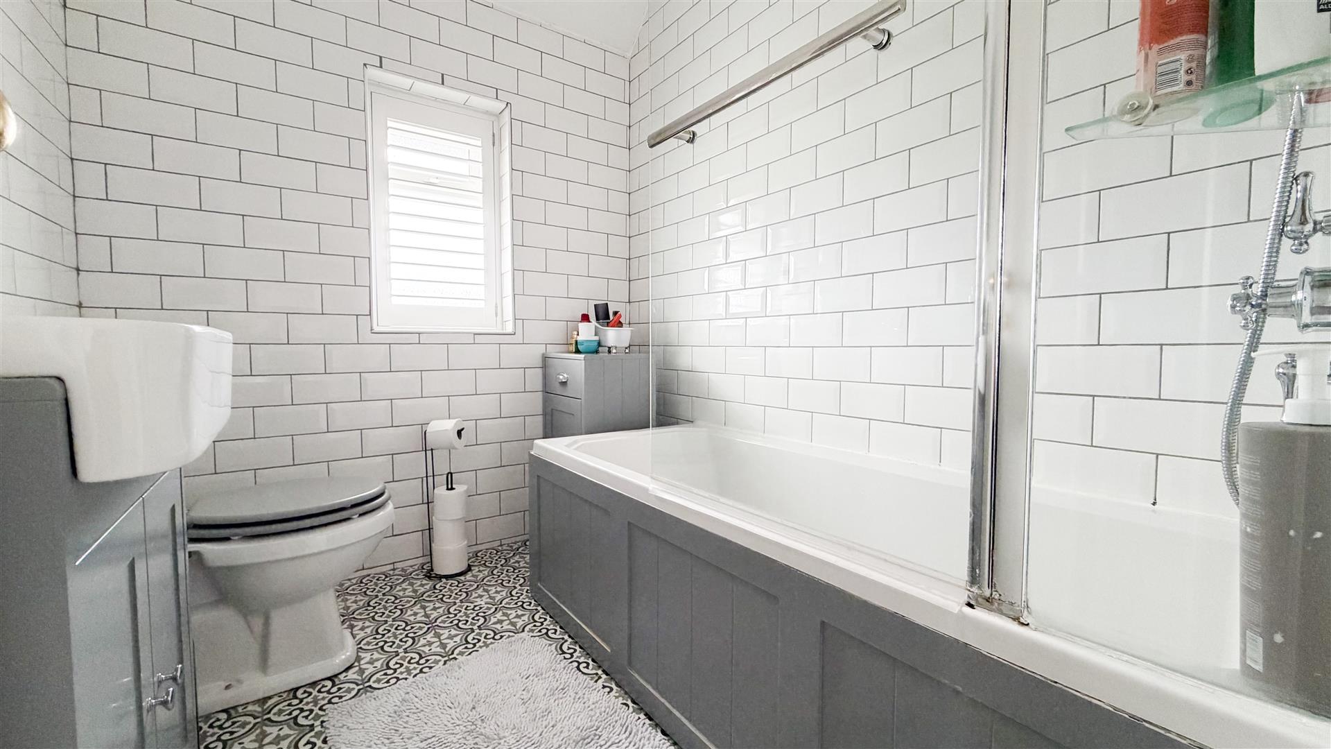 Three piece suite. Low level WC. Panel enclosed bath with wall mounted shower. Wall mounted sink in vanity unit with cupboards under. Radiator. Fully tiled walls. Double glazed window to rear.