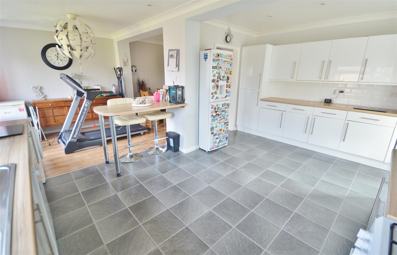 Large fitted kitchen suite. Comprises laminated rolled edge work surfaces. Inset one and a half bowl single drainer stainless steel sink unit with mixer tap. Space for gas cooker with extractor hood above (not tested). Space and plumbing for washing machine and dishwasher. Space for fridge and freezer. Selection of matching wall units with cupboards and drawers at both eye and floor level. Tiled splashbacks. Cupboard housing wall mounted gas boiler (not tested). Double glazed window to rear. UPV double glazed side door leading to outside side.