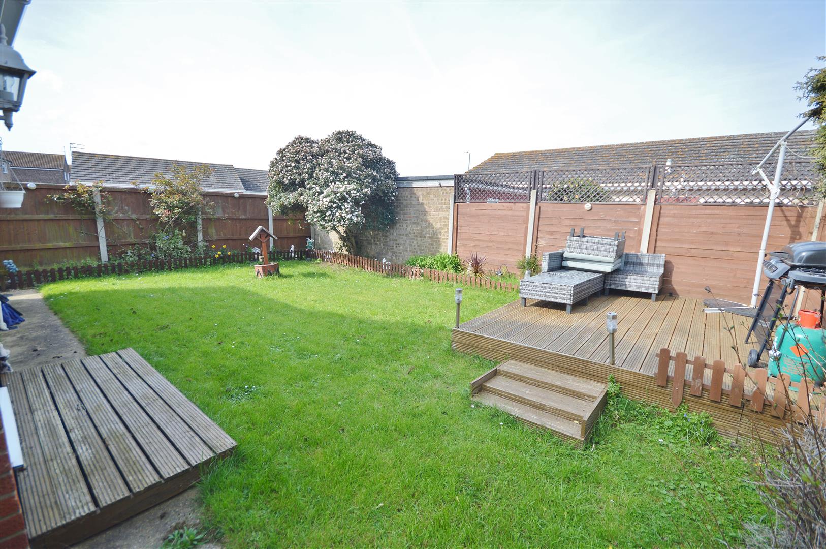 Raised decked patio area. Remainder laid to lawn. Enclosed by panel fencing. Side pedestrian access to front.