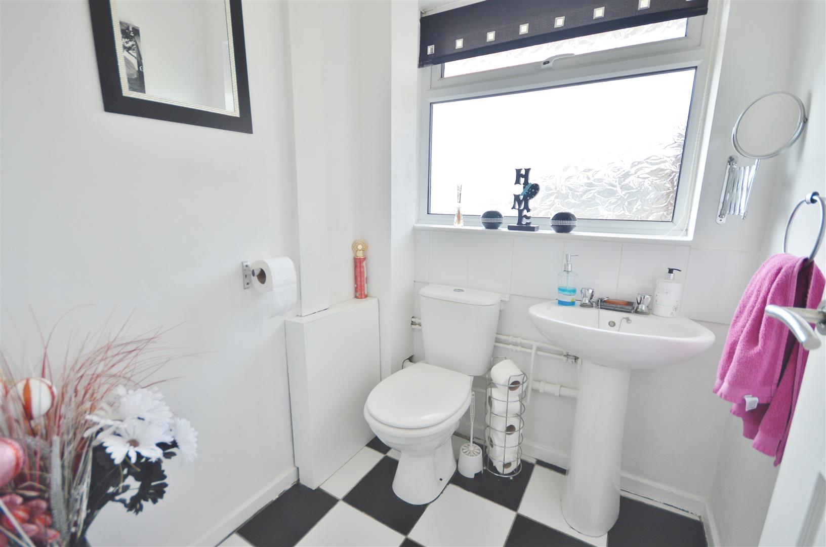 Two piece white suite. Comprises low level W.C. Pedestal wash hand basin. Part tiled walls. Double glazed window to front.