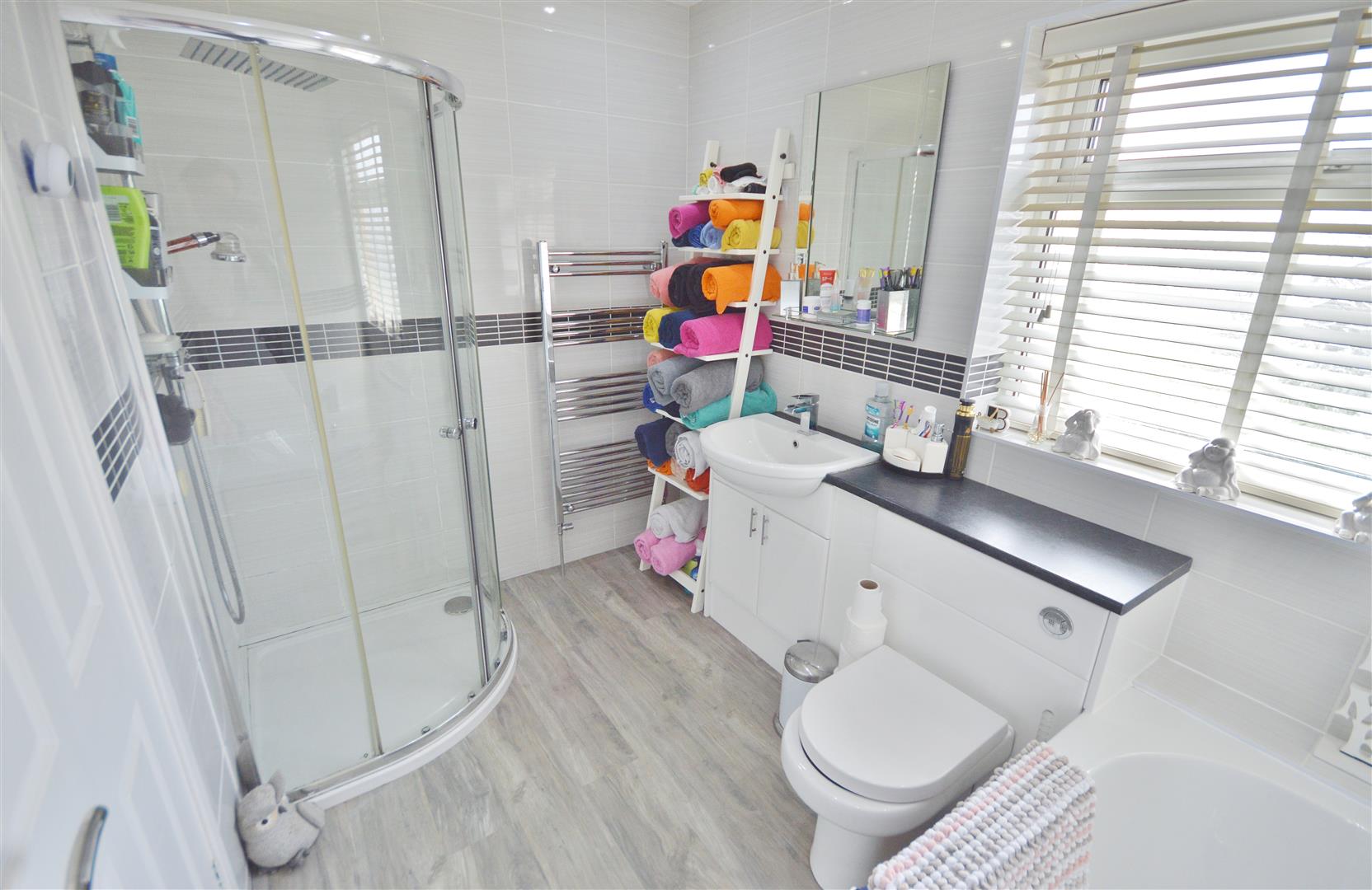 Fitted with a white four piece suite. Comprises low level W.C. Vanity wash hand basin with mixer taps and cupboards below. Panel bath with mixer tap. Walk in shower cubicle with wall mounted stainless steel shower fitments. Fully tiled walls. Heated towel rail. Double glazed window to side.