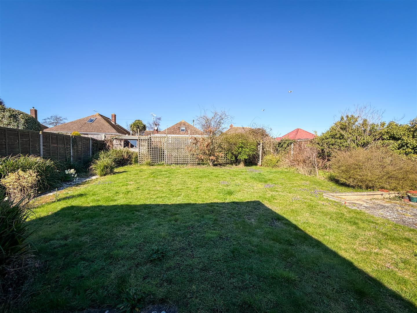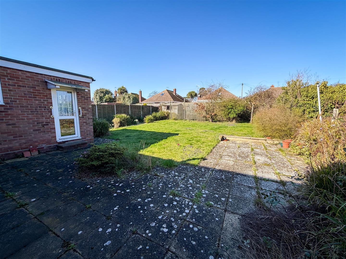 Patio paved area with the majority being laid left to lawn. Enclosed by panelled fencing. One wooden storage shed. One greenhouse. Borders aligned with flowers and shrubs. UPVC double glazed door leading to garage. Side pedestrian access leading to outside front.