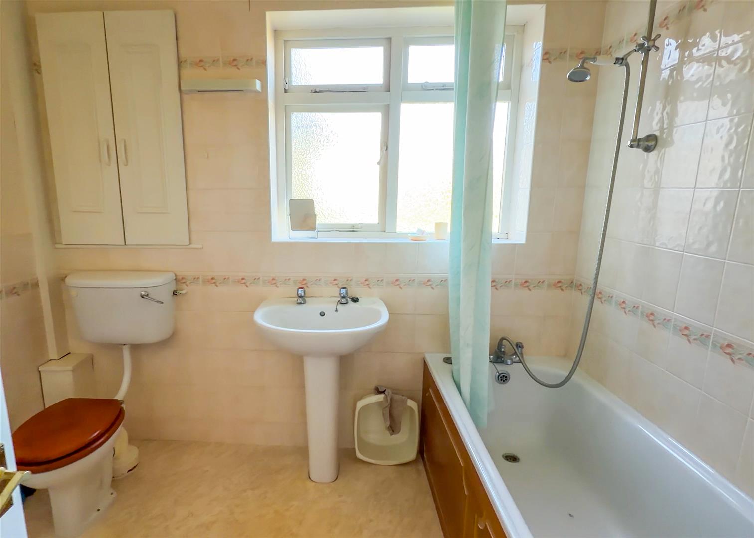 Three piece white suite comprising low level W.C. Pedestal hand wash basin. Panelled bath with wall mounted shower attachment above. Majority tiled. Heated towel rail. Airing cupboard. Glazed windows to rear.