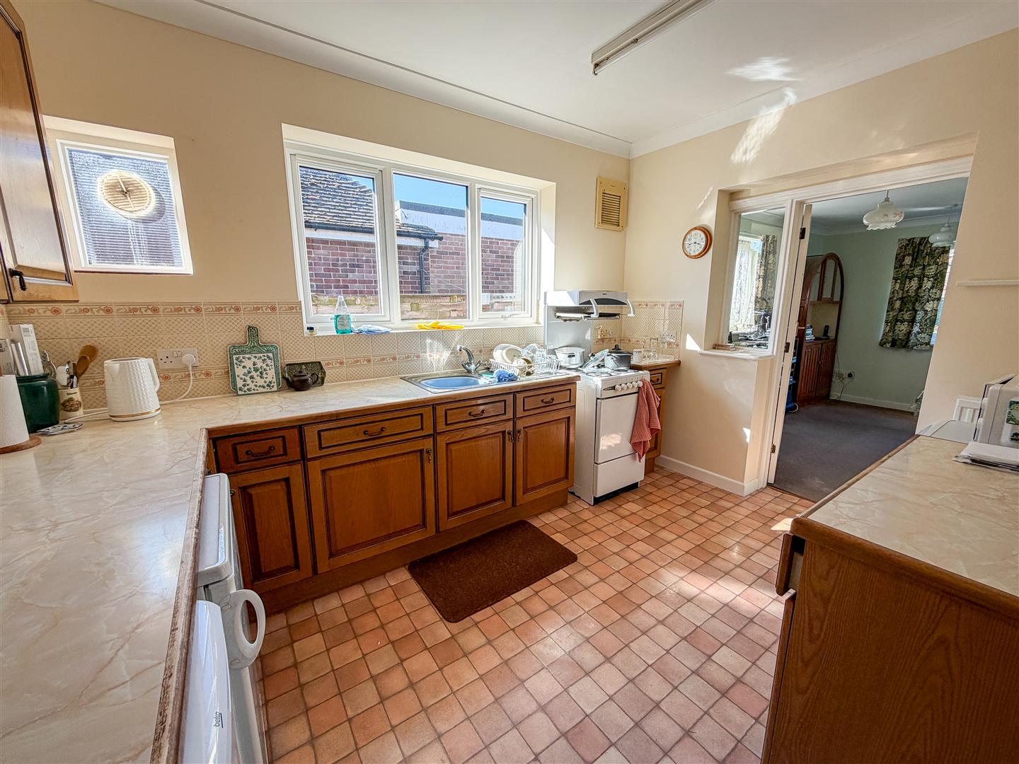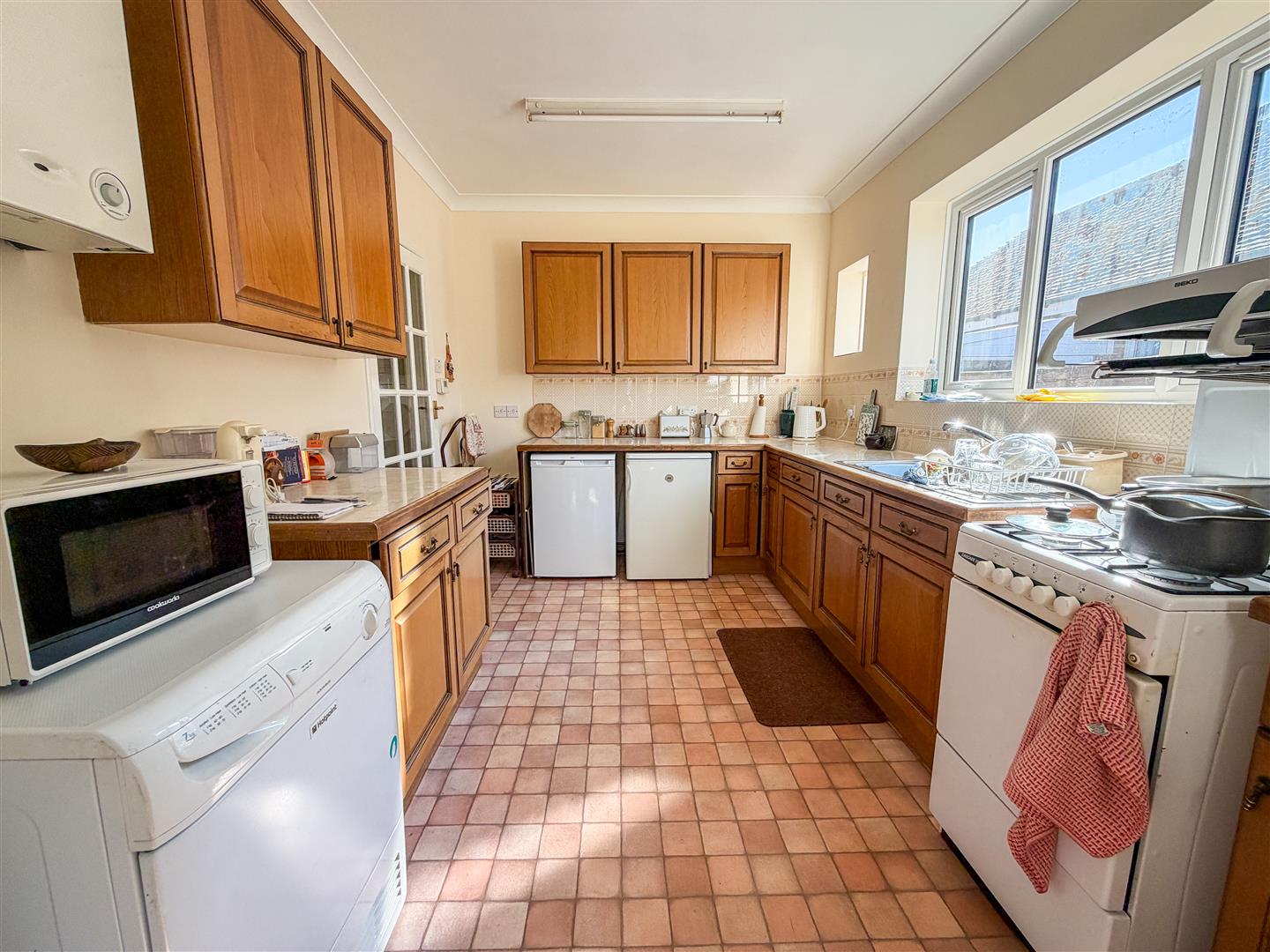 Fitted kitchen suite comprising rolled edge work surfaces with inset single drainer stainless steel sink unit with a stainless steel mixer tap. Space for cooker. Space for fridge and freezer. Selection of matching wall units with cupboards and drawers at both eye and floor level. Partly tiled. Wall mounted gas combination boiler (not tested). Radiator. Double glazed windows to side. Door to: