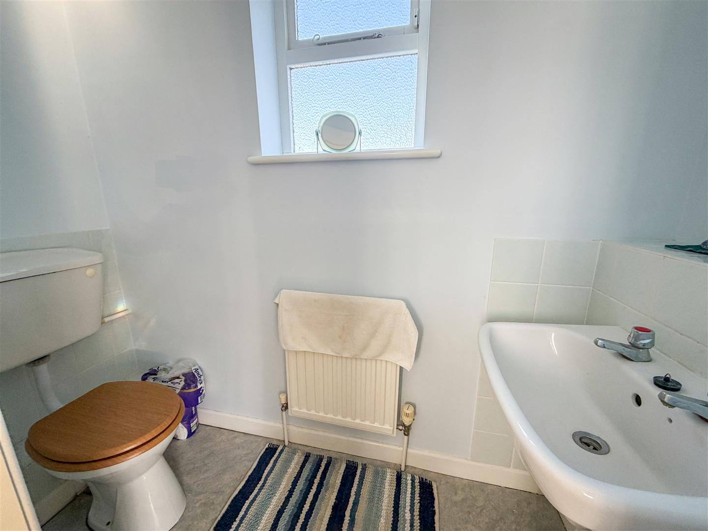 Two piece suite comprising low level W.C. Wall mounted hand wash basin. Partly tiled. Radiator. Glazed window to side.