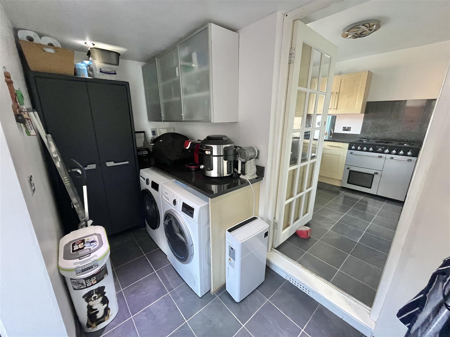 Space for washing machine and tumble dryer. Radiator. Double glazed door to garden. Door to: