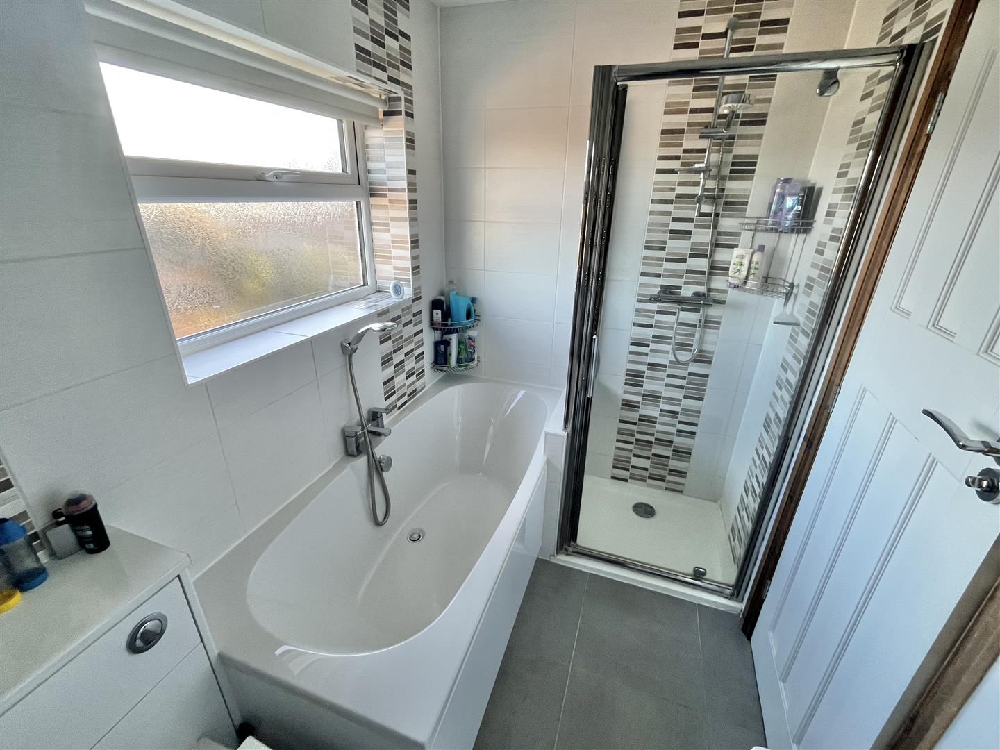 Fitted with a four piece bathroom suite comprising panelled bath with mixer tap and wall mounted shower head. Step in shower cubicle with mains mixer shower (not tested). Low level W.C. Vanity wash hand basin with cupboards below. Heated towel rail. Fully tiled walls. Double glazed window to rear.