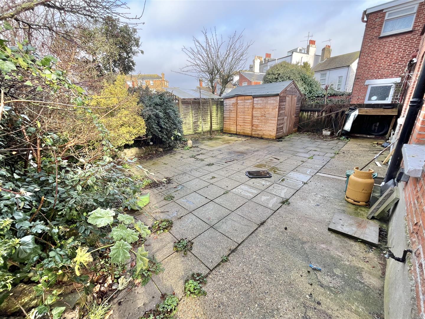 Fully paved patio garden with a wooden storage shed. Side access leading to front.