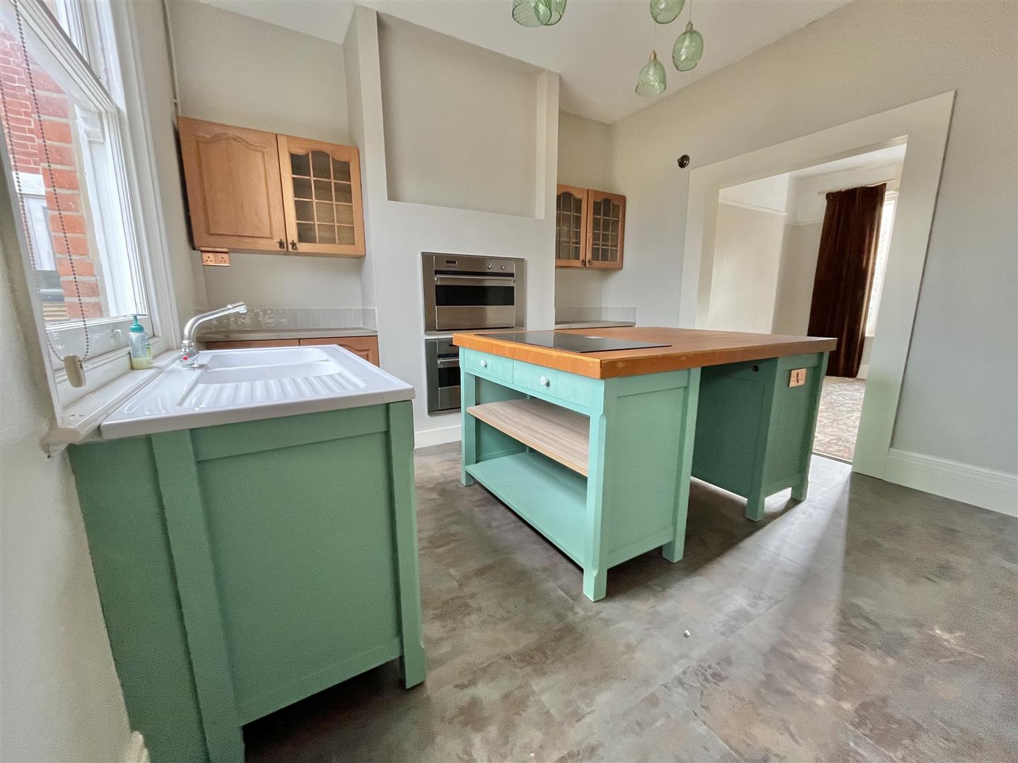 Inset gas oven. Inset four ring gas cooker. Inset two and a half bowl sink unit with a stainless steel mixer tap. Cupboard housing gas boiler. Radiator. Single glazed windows to side and rear. (All appliances not tested).