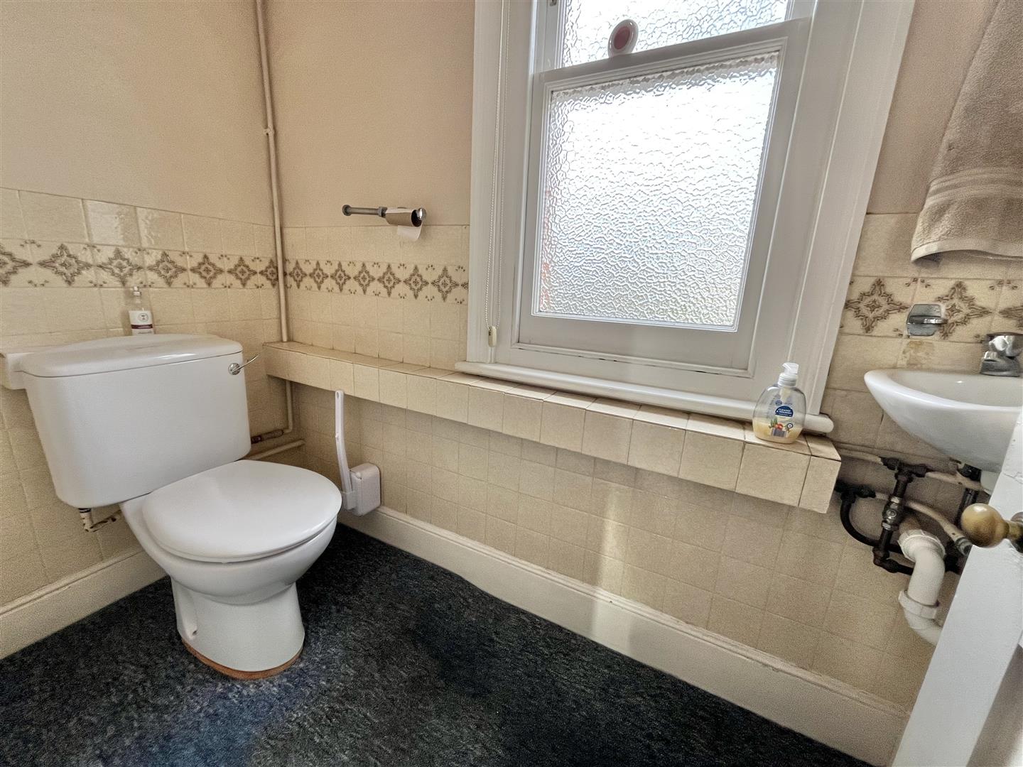 Low level W.C. Mounted wash hand basin sink unit. Single glazed window to rear.
