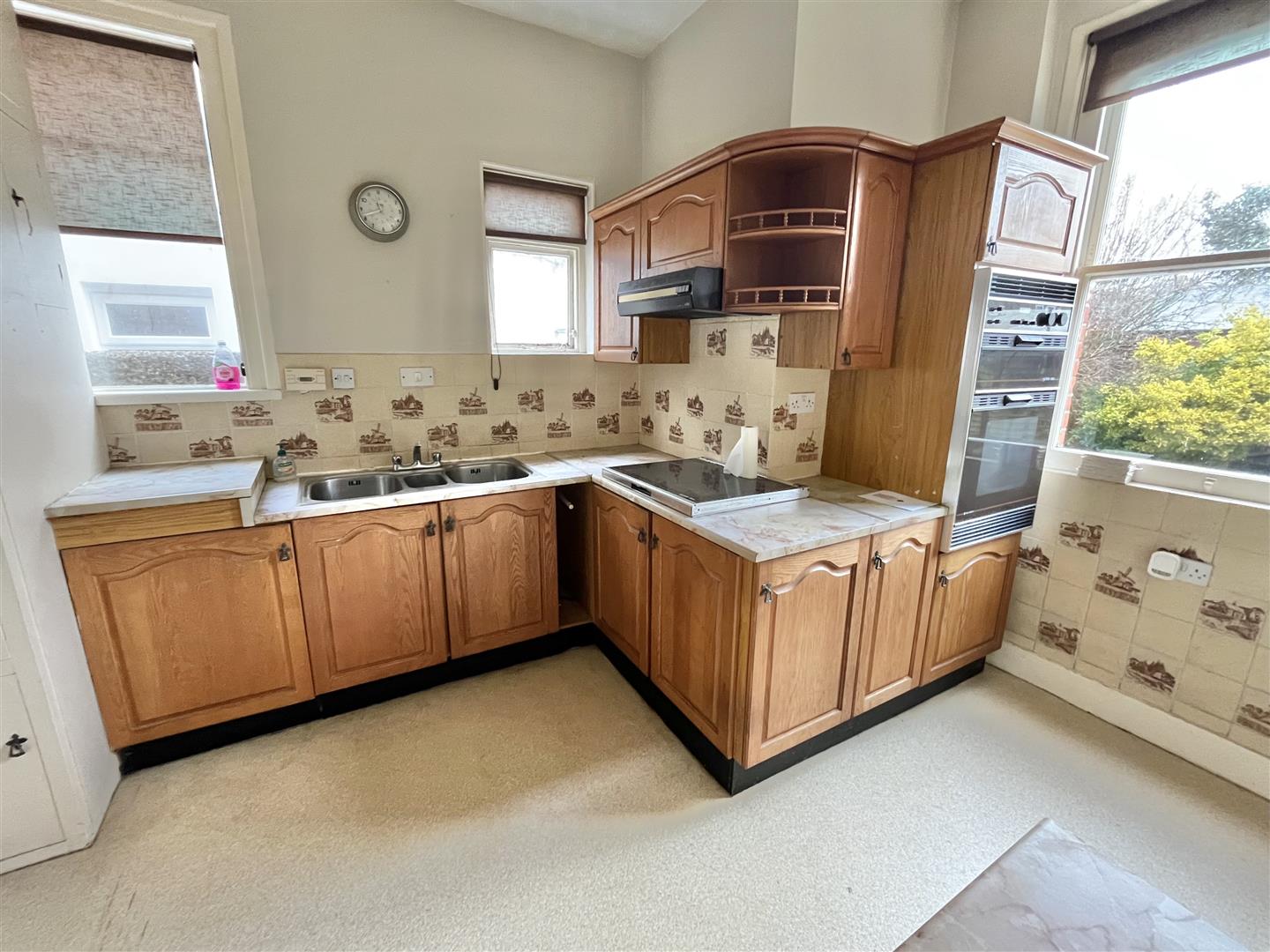 Kitchen suite comprising Oakwood style work surfaces with matching wall mounted units with cupboards and drawers below. Five ring ceramic hob. One and a half bowl sink unit a stainless steel mixer tap. inset twin oven. Single glazed window to rear. (All appliances not tested).