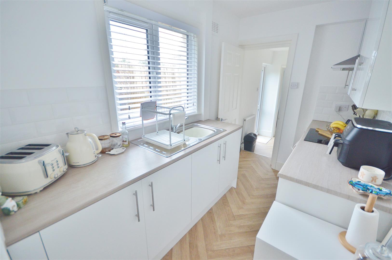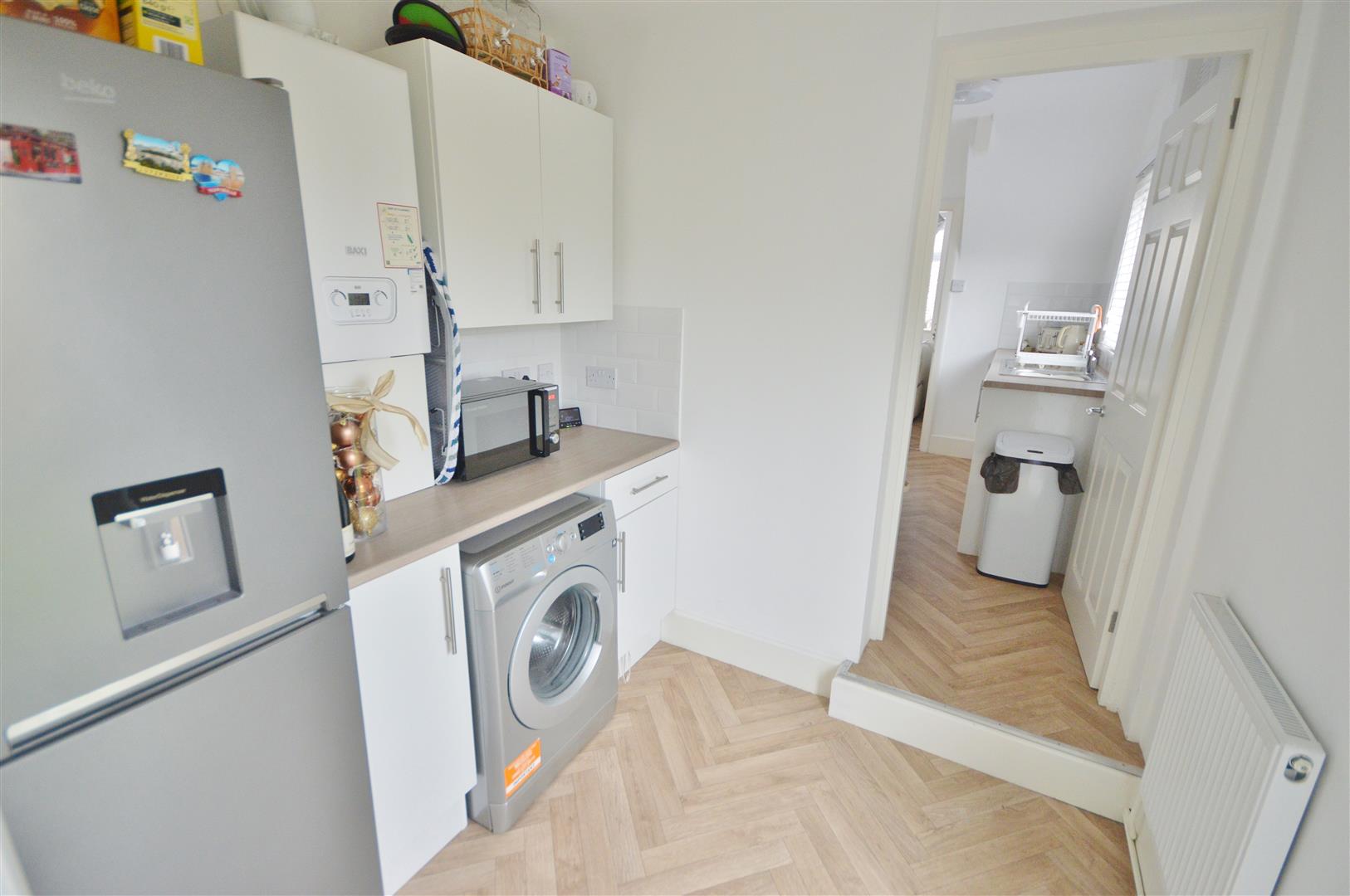 Fitted units with rolled edge laminate work tops with space and plumbing under for washing machine. Selection of matching wall units with cupboards and drawers at both eye and floor level. Wall mounted gas combination boiler (not tested). Space for fridge freezer. Radiator. UPVC Double glazed side door leading to the outside rear. Door to: