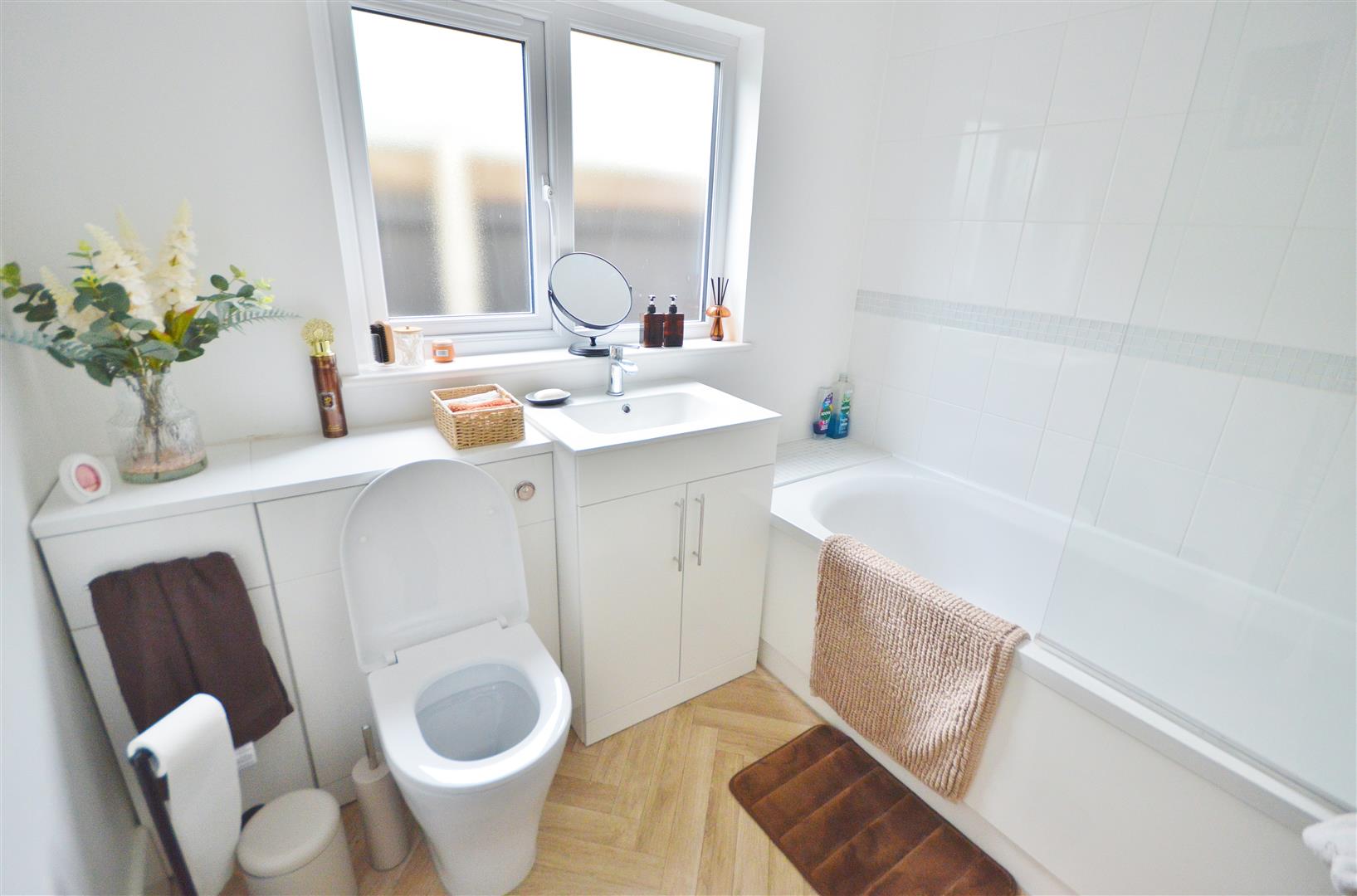 Three piece white suite comprising low level W.C. Vanity hand wash sink basin with stainless steel mixer tap. Panelled bath with wall mounted shower head attachment above. Heated towel rail. Double glazed window to rear.
