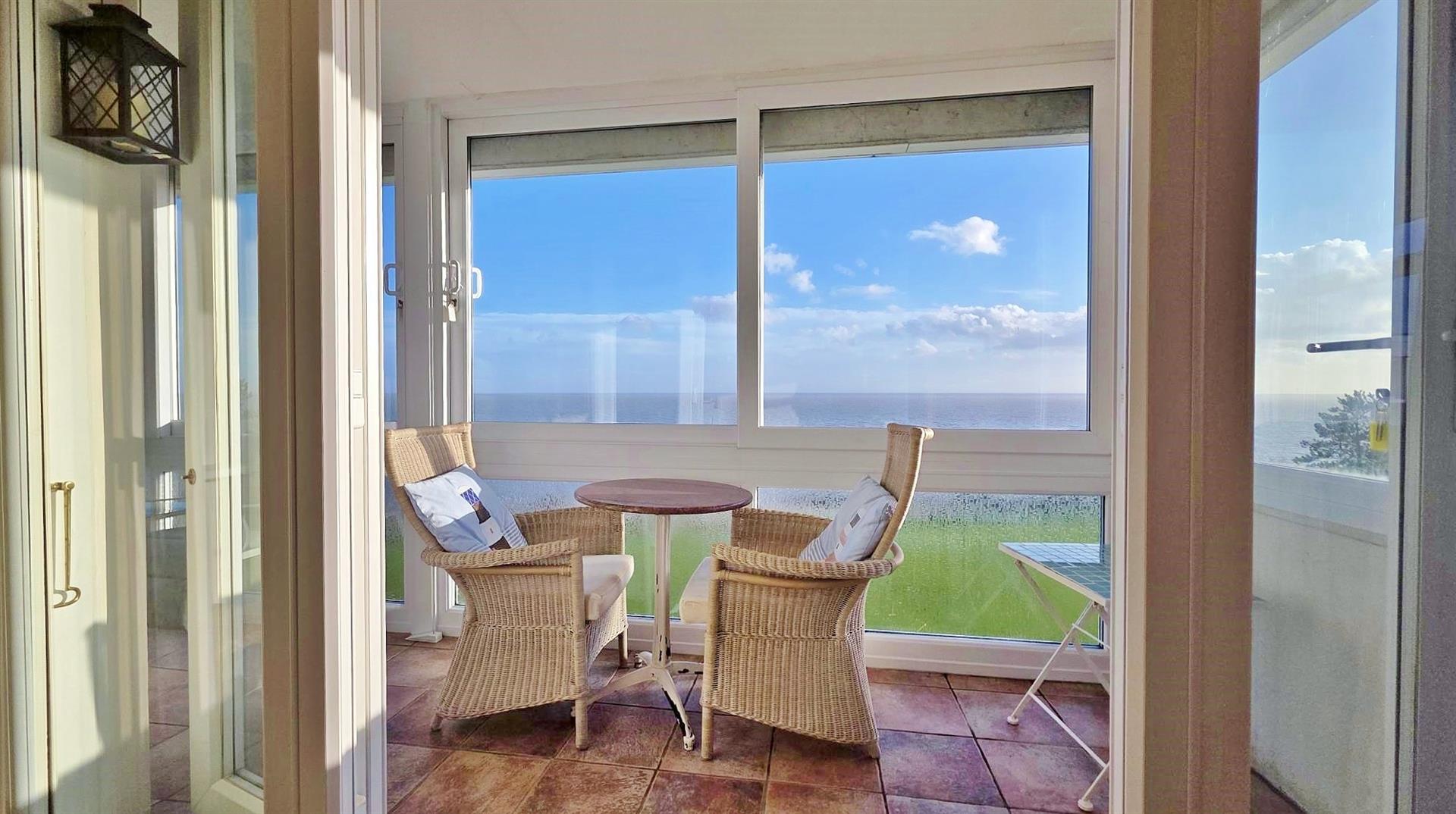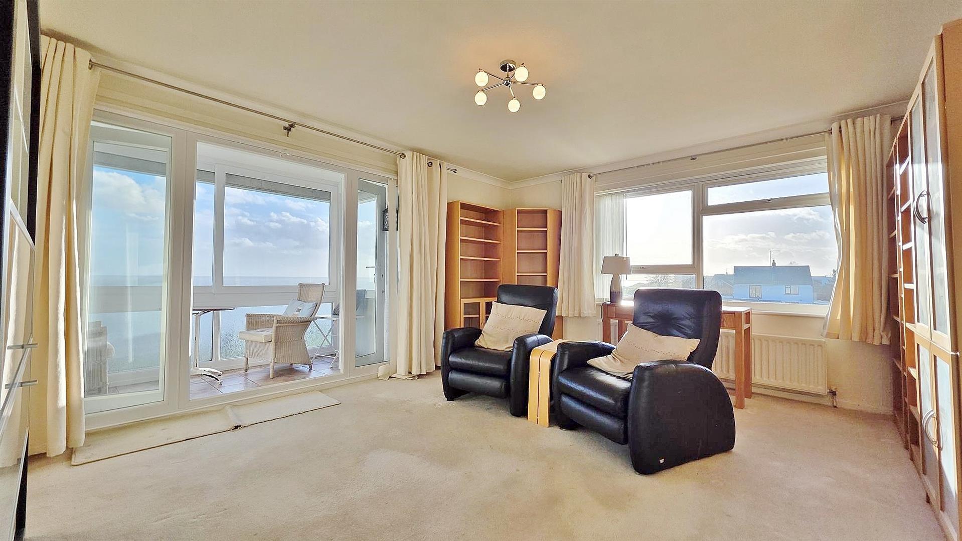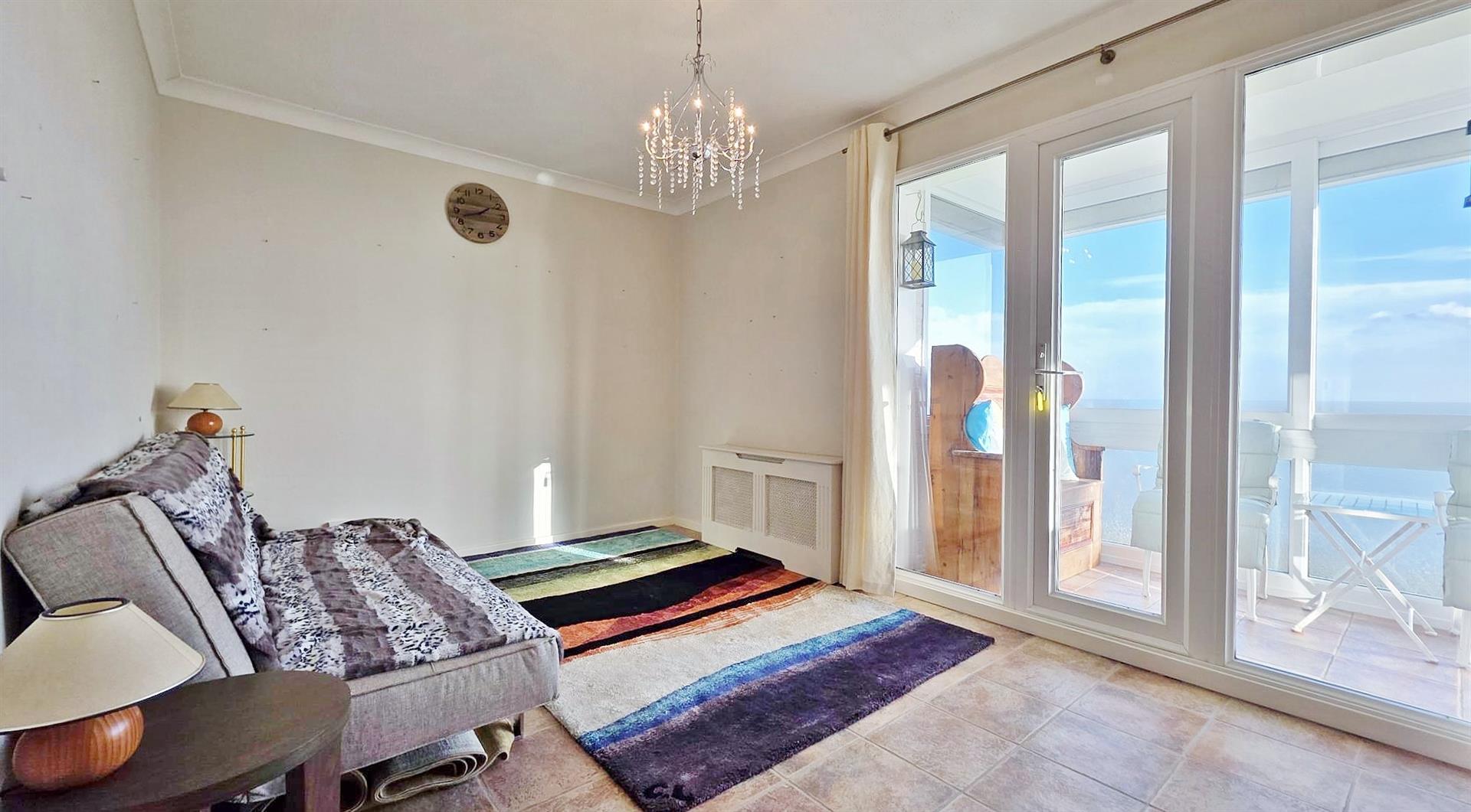 Radiator. Sealed unit double glazed window to side with stunning sea views. Sealed unit double glazed French style doors with matching full length double glazed picture windows leading to:-