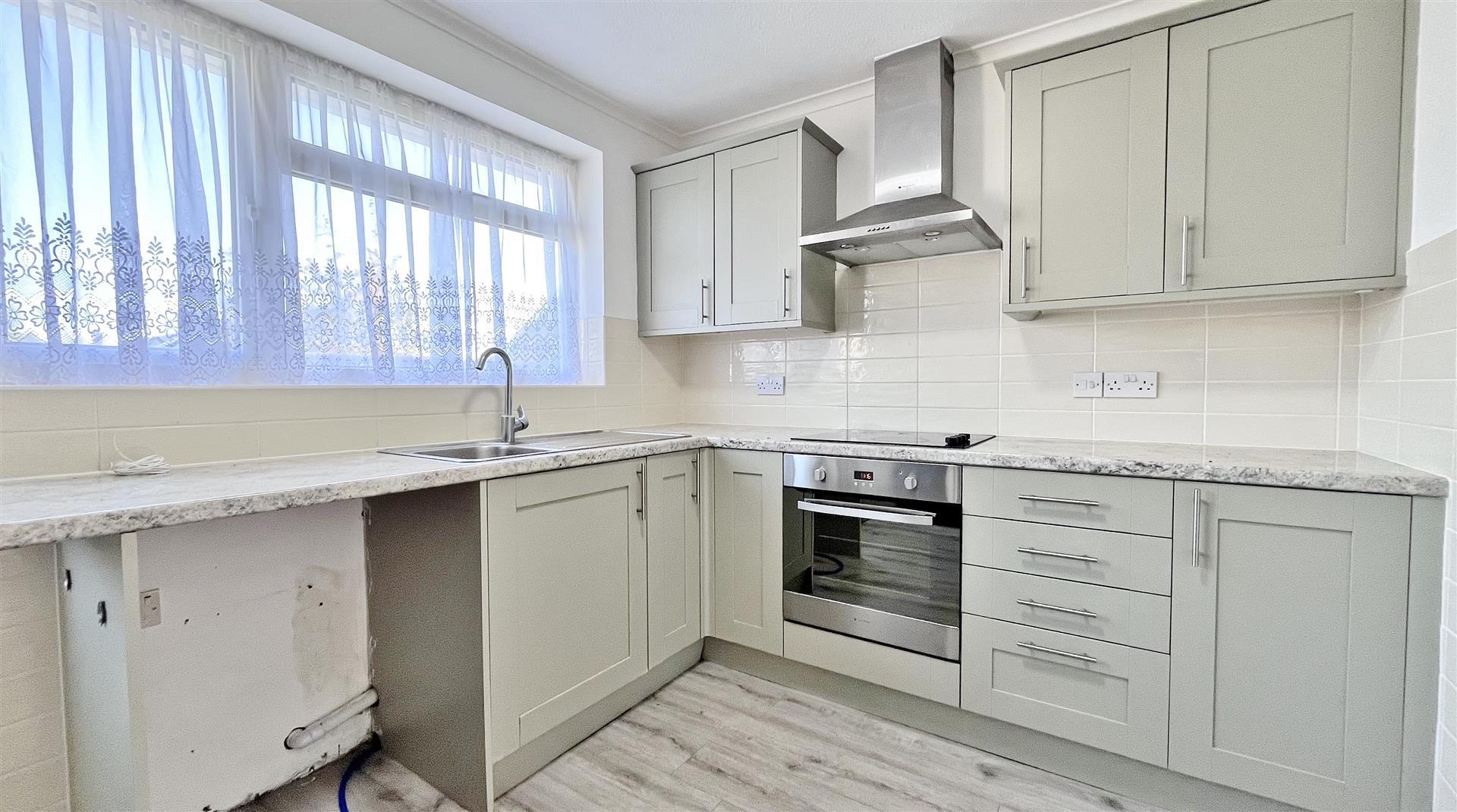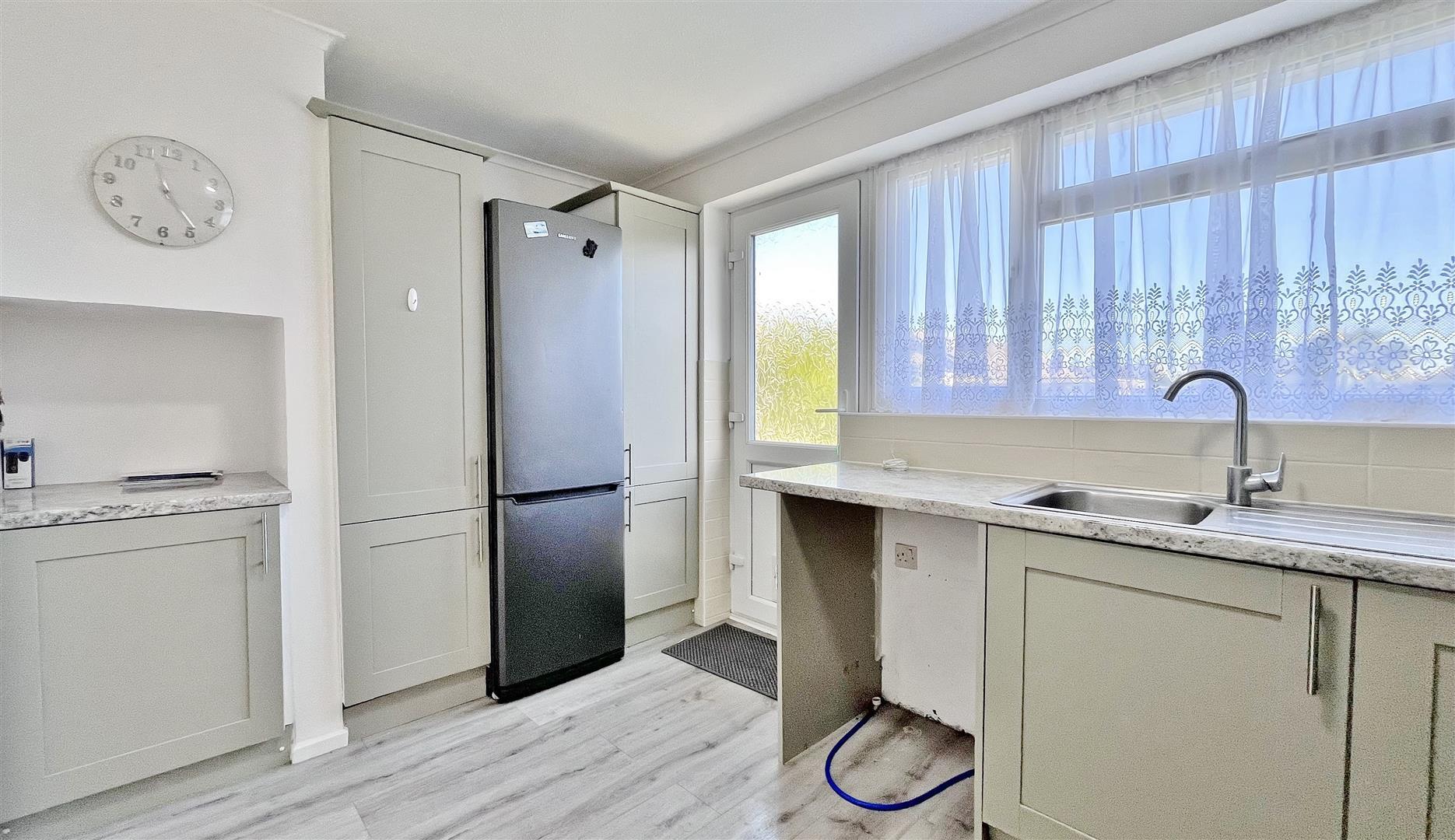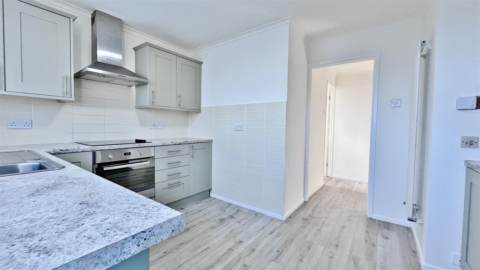 Fitted with a range of matching fronted units. Inset stainless bowl sink and drainer unit. Inset four ring electric hob with electric oven under. Fitted extractor hood. Further selection of matching units at both eye and floor level. Plumbing for washing machine. Space for fridge/freezer. Part tiled walls. Laminate flooring. Featured full length radiator. Sealed unit double glazed window to rear. Obscured sealed unit double glazed door leading to:
