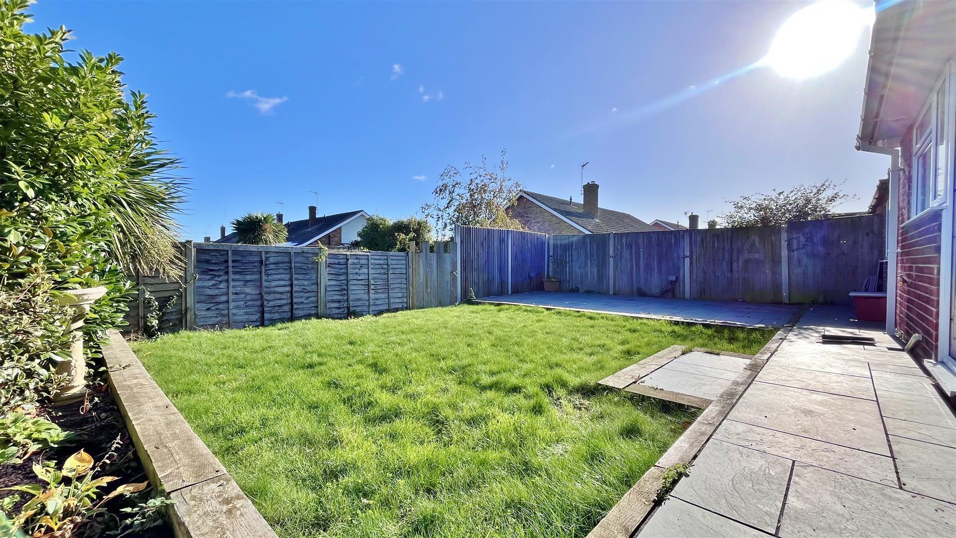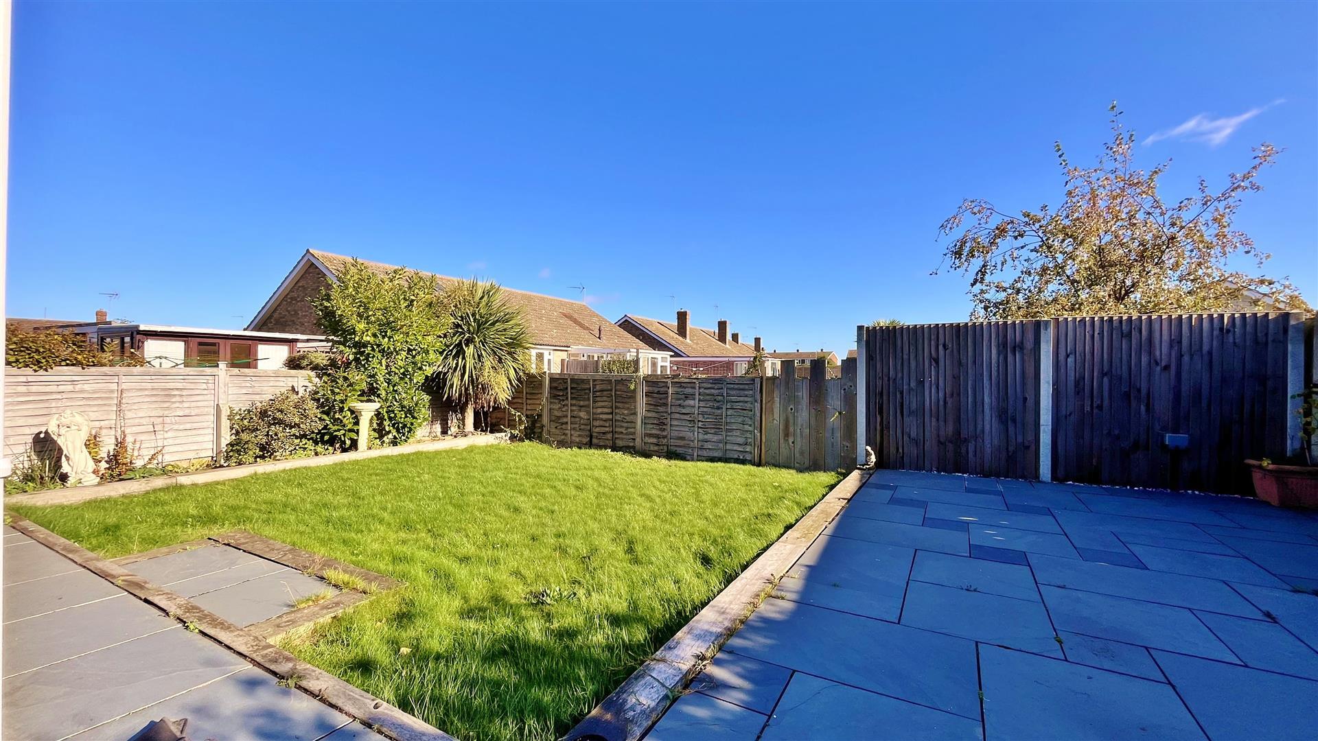 Part paved area. Remainder laid to lawn. Beds stocked with trees. Private access door to garage. Outside tap. Enclosed by panel fencing.