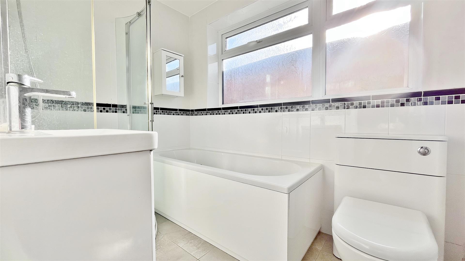 Four piece suite. Low level WC. Vanity hand wash basin with mixer tap and storage space under. Enclosed panelled bath. Fitted corner shower cubicle with wall mounted shower attachment. Fully tiled walls. Tiled flooring. Wall mounted heated towel rail. Obscured sealed unit double glazed window to side.