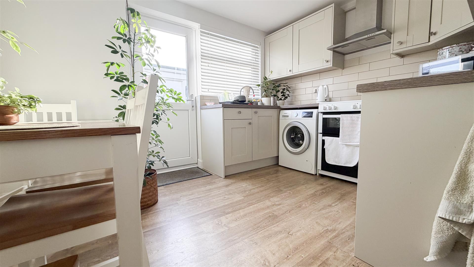 Selection of panelled fronted units at both eye and floor level. Laminated square edge work surfaces with inset stainless steel sink unit. Part tiled walls. Space and plumbing for washing machine. Space for cooker. Radiator. Double glazed window and door to rear.