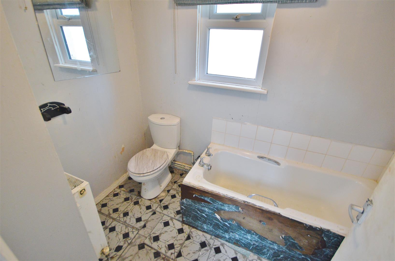 Three piece suite comprising; Low level W.C. Panelled bath. Pedestal hand ash sink basin. Radiator. Double glazed window to side.