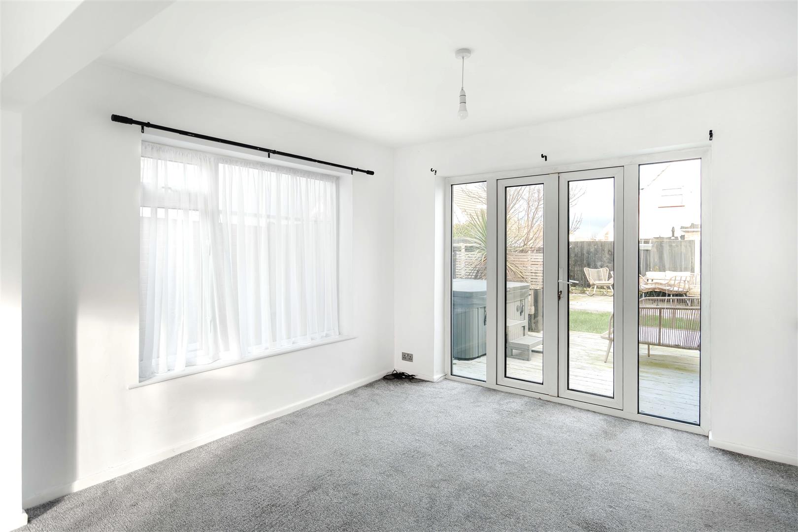 Radiator. Double glazed window to side, Double glazed French style doors with Side Picture windows to rear garden. Door to Kitchen.