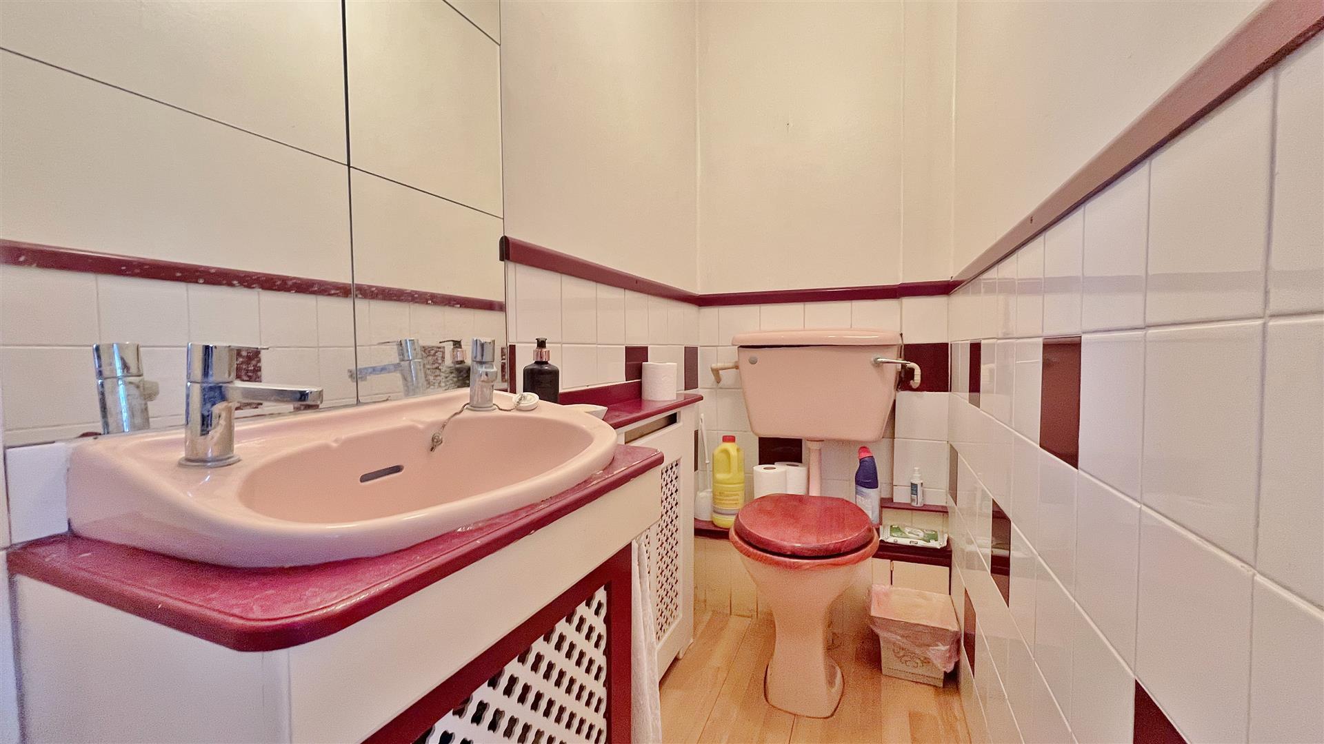 Suite comprises of low level w/c. Vanity wash hand basin with storage cupboard under. Radiator. Part tiled walls. Wood effect laminate flooring. Extractor fan.