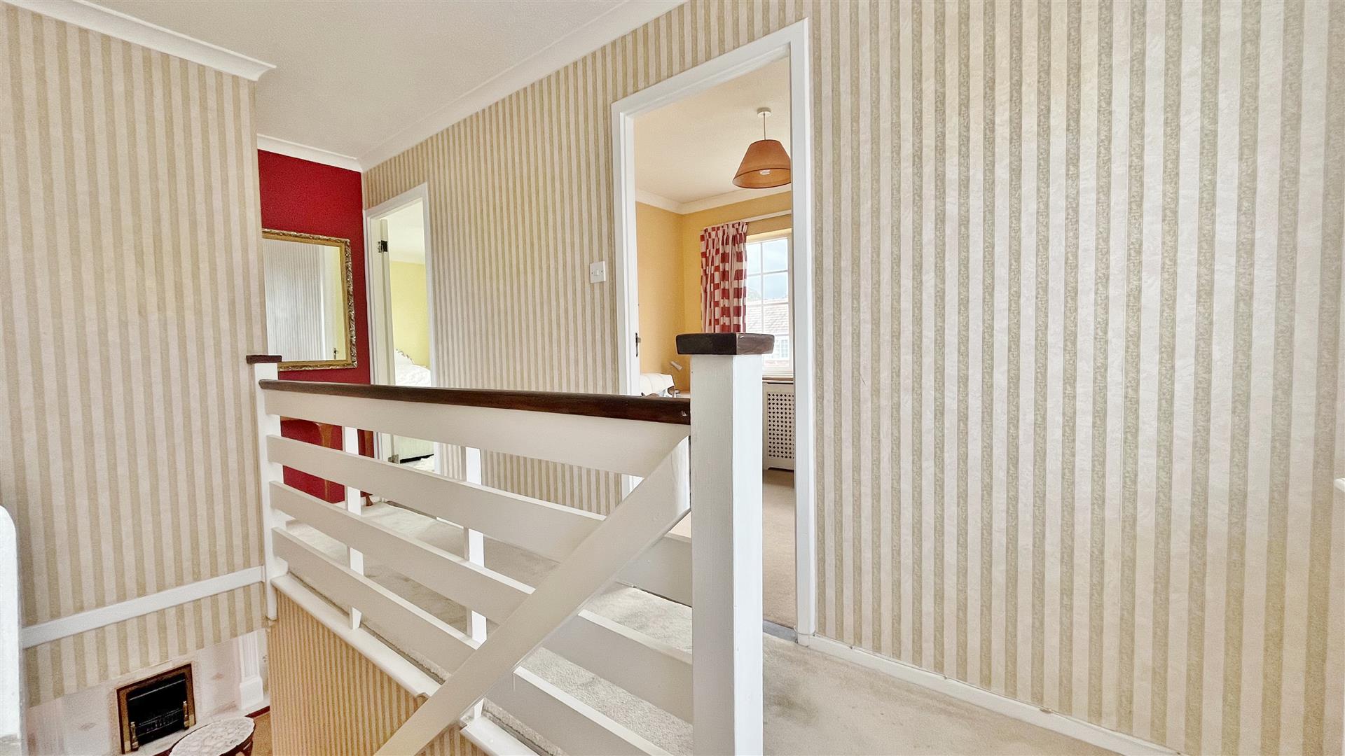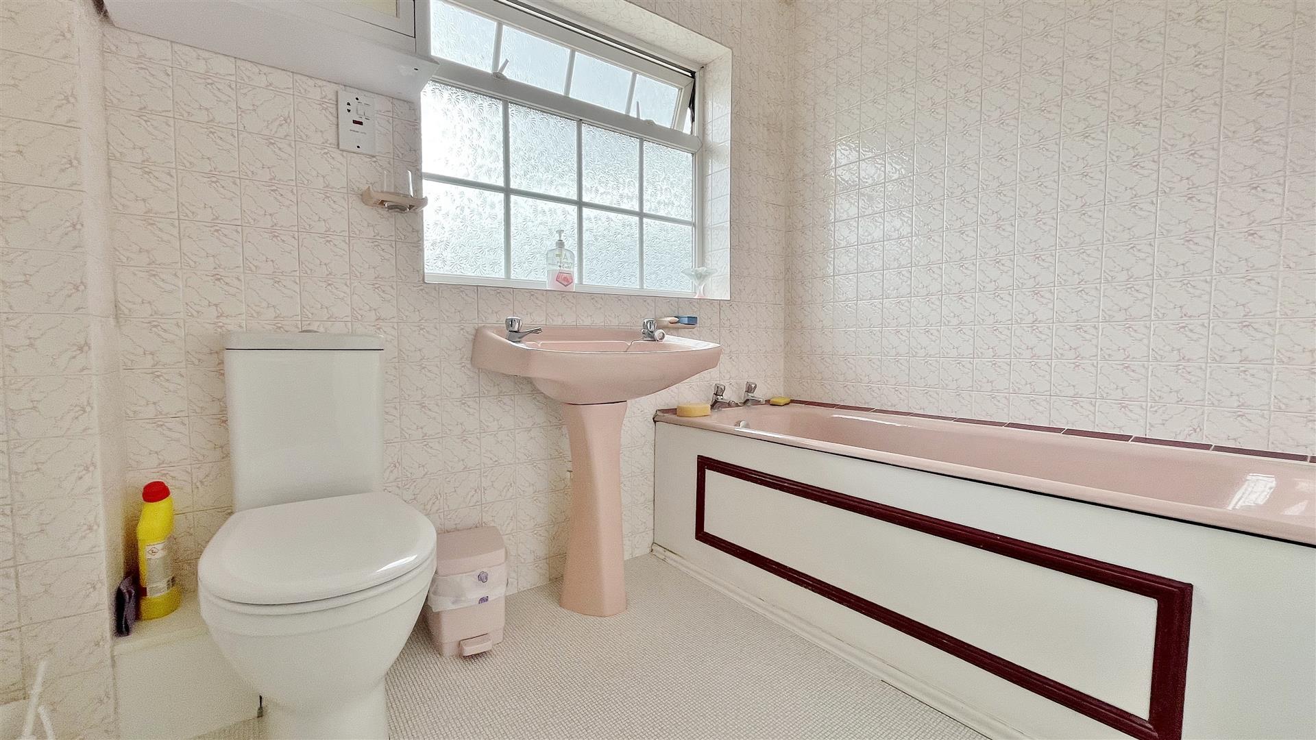 Suite comprises of low level w/c. Pedestal hand wash basin. Fitted panelled bath. Built in airing cupboard housing hot water cylinder. Radiator. Fully tiled walls. Vinyl flooring. Obscured sealed unit double glazed window to rear.