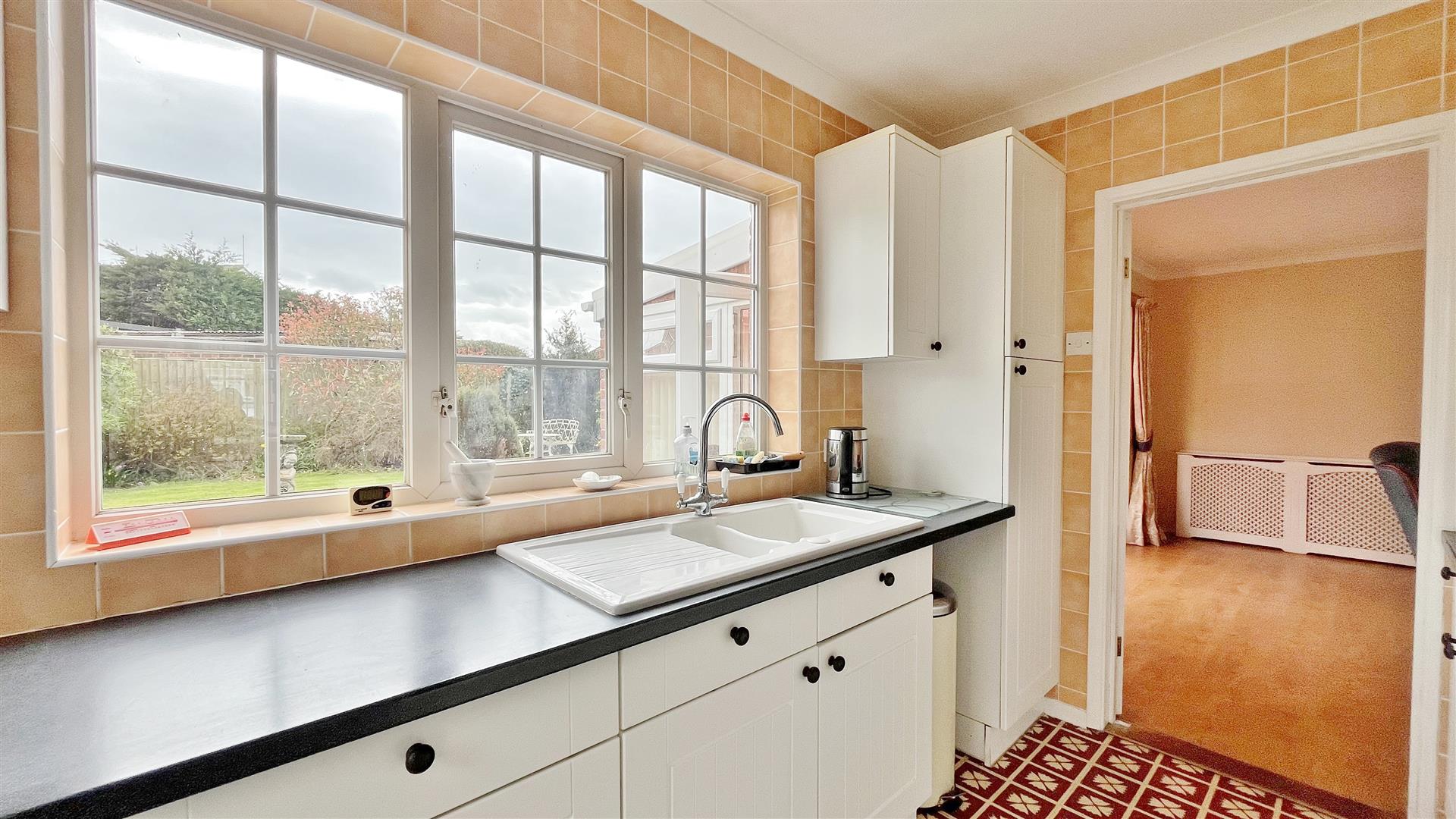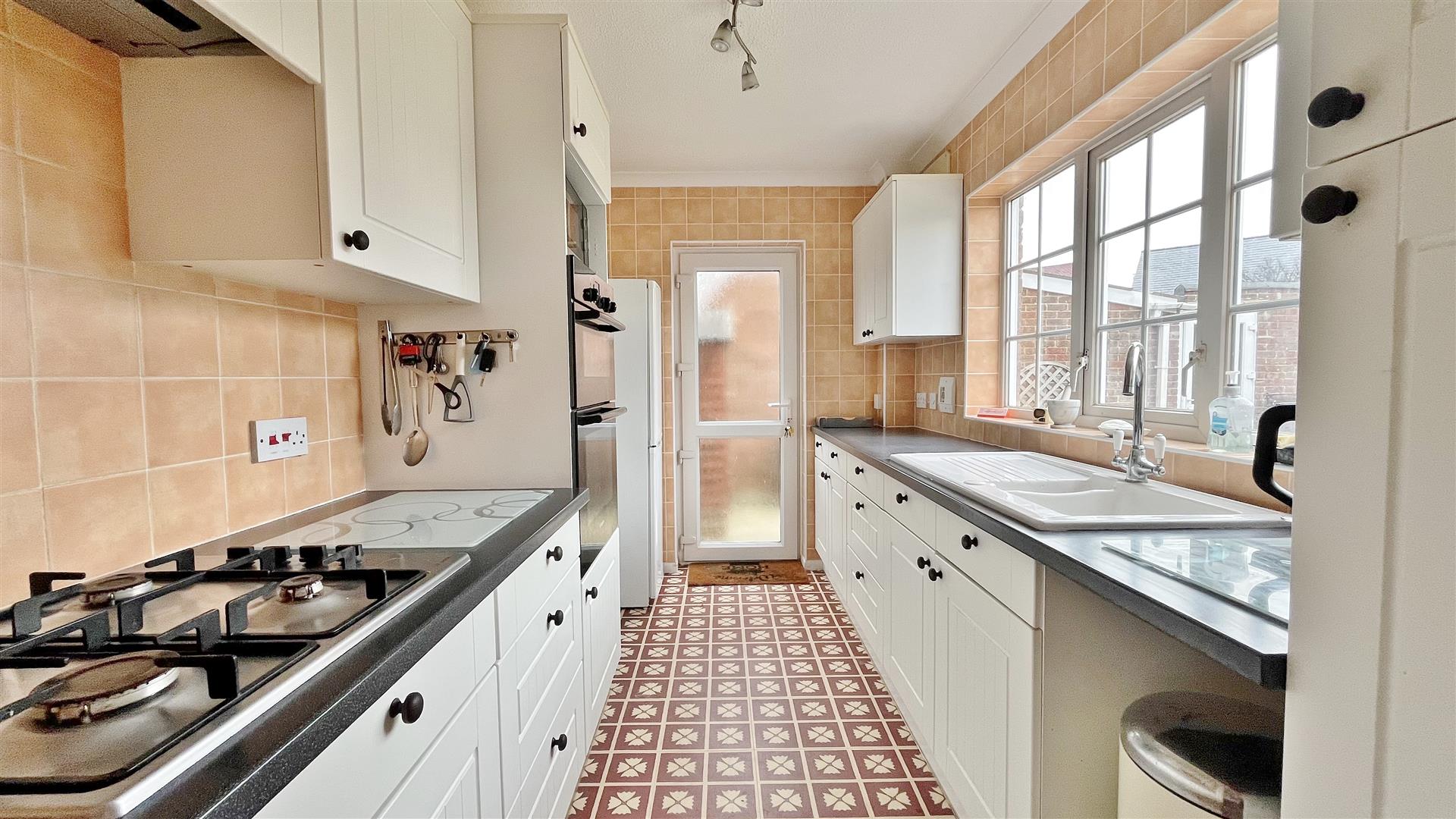 Fitted in a range of matching fronted units. Rolled edge work surfaces. Inset glazed ceramic one and a half bowl sink and drainer unit. Inset four ring gas hob with extractor hood above. Built in eye level electric oven and grill. Further selection of matching fronted units both eye and floor level. Space for fridge/freezer. Vinyl tiled flooring. Sealed unit double glazed window to rear. Obscured sealed unit double glazed door to garden.