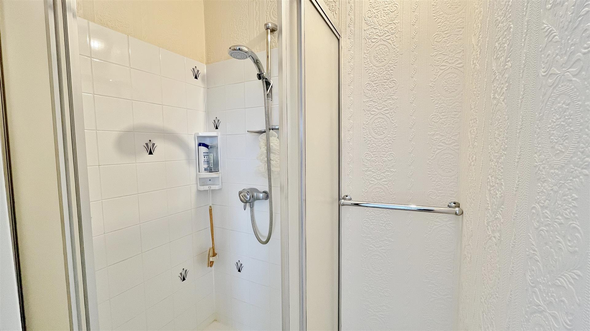 Fitted shower cubicle with wall mounted shower attachment. Part tiled walls.