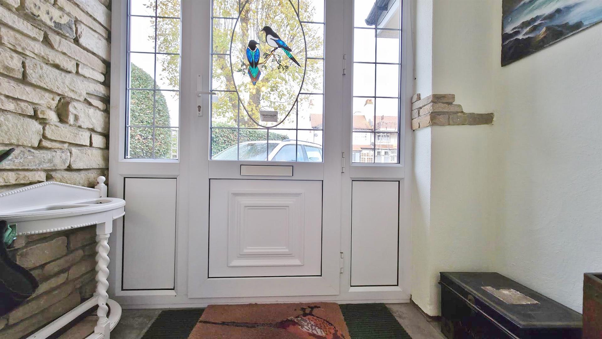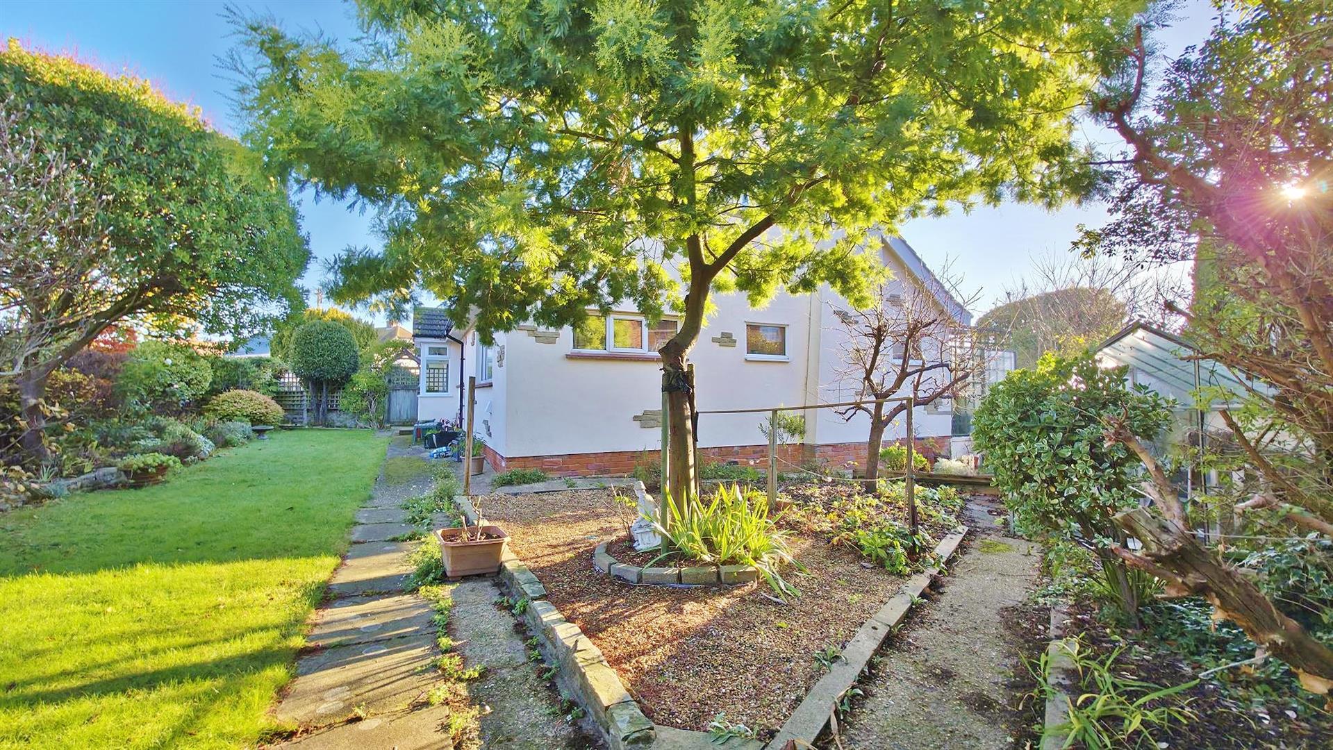 Block paved driveway providing off street parking for several vehicles leading to garage with double doors. Remainder laid to lawn. Featured border stocked with flowers.