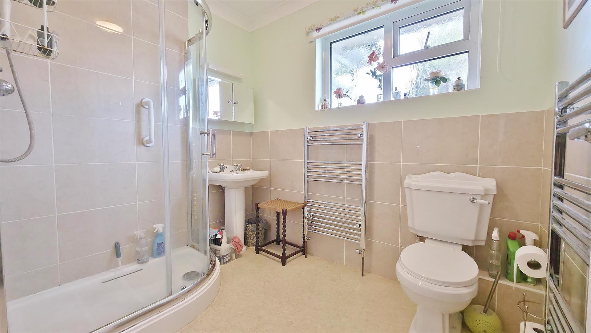White suite comprises of low level WC. Pedestal wash hand basin. Enclosed panelled bath with shower hose attachment. Part tiled walls. Vinyl flooring. Loft access. Extractor fan. Built in storage cupboard with integral shelving. Wall mounted heated towel rail. Obscured sealed unit double glazed window to side. Door to: