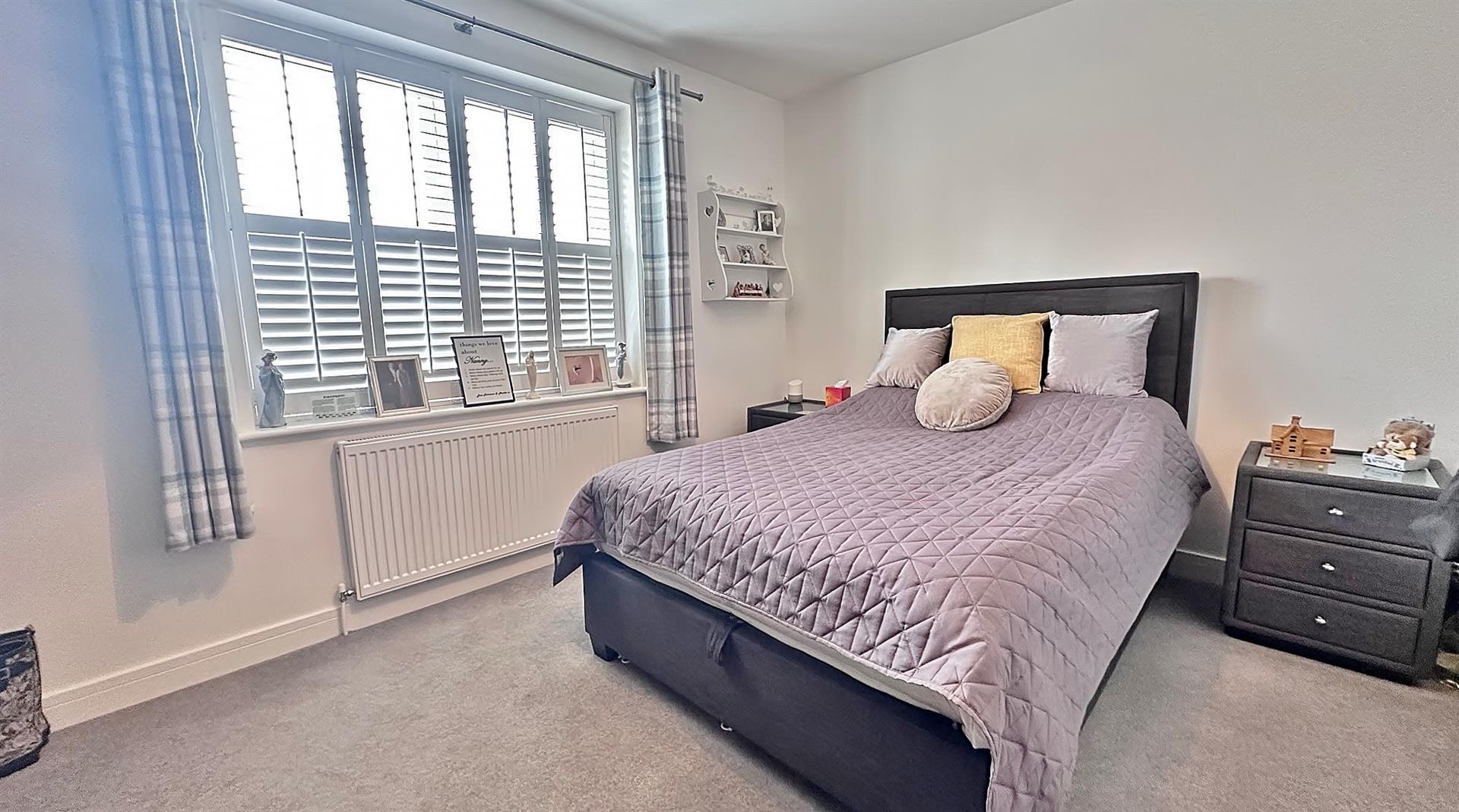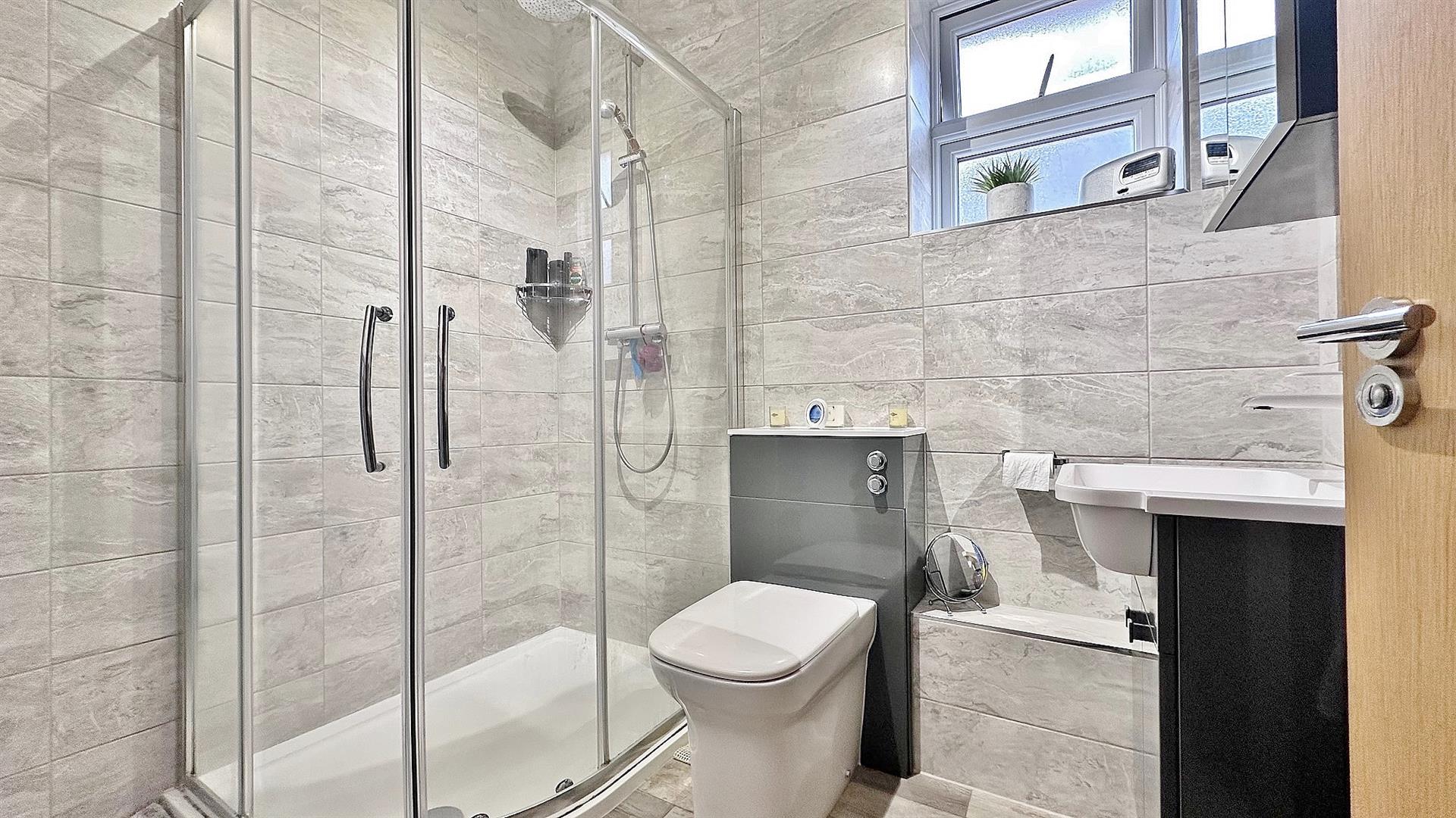 Modern white suite comprises low level w/c. Vanity wash hand basin with storage cupboard under. Independent shower cubicle with wall mounted shower (not tested) Fully tiled walls. Heated towel rail. Double glazed window to side.