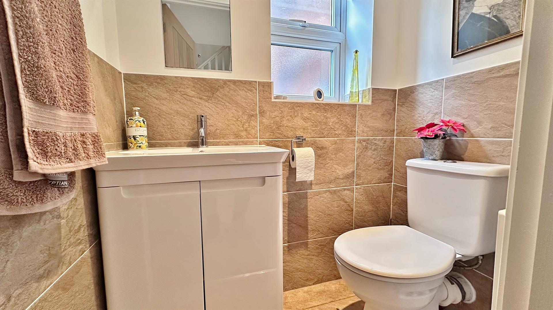 Low level w/c. Vanity wash hand basin with cupboard under. Half tiled walls. Radiator. Double glazed window to side.