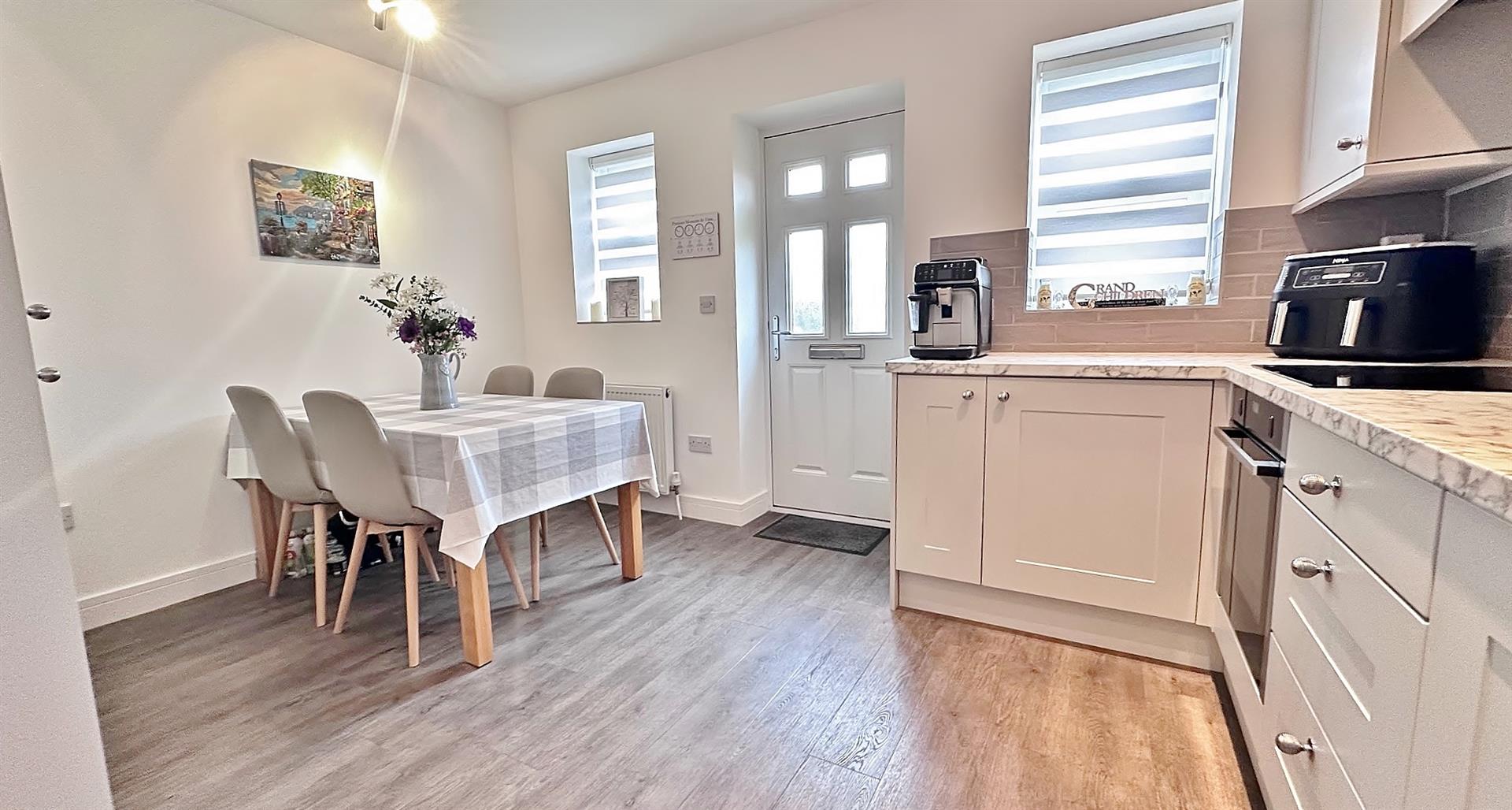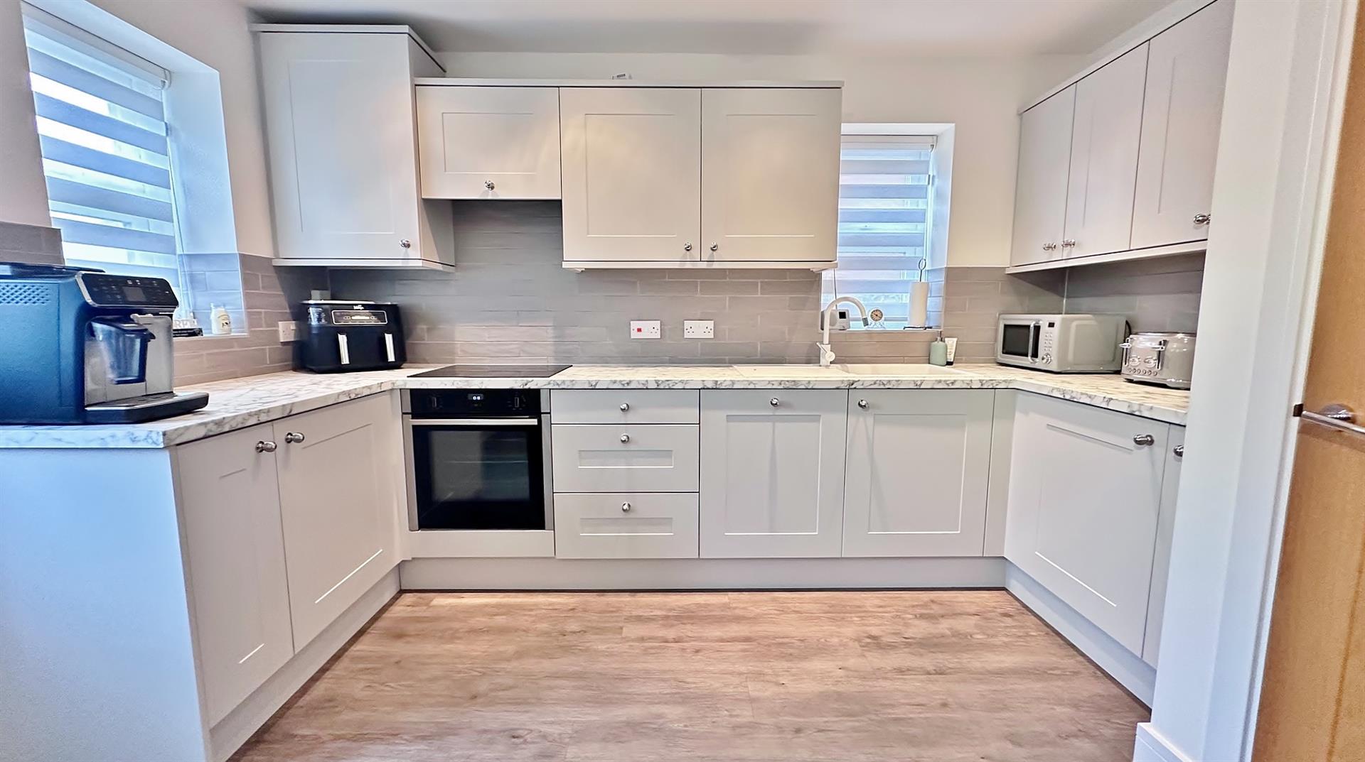 Modern fitted kitchen comprises square edge worksurfaces with inset single drainer sink unit. Inset four ring electric hob with oven under. Integrated washing machine, dishwasher and fridge/freezer (all appliances not tested). Selection of matching shaker style units at both eye and floor level. Wall mounted boiler concealed in cupboard (not tested). Radiator. Two double glazed windows to front. Double glazed window to side. Door to:-