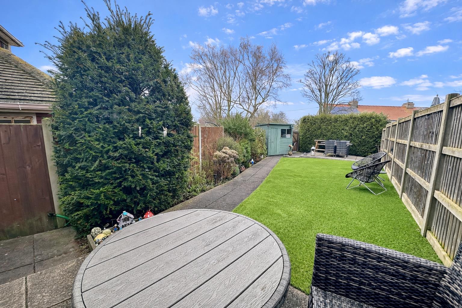 Laid to artificial lawn with central pathway. Enclosed by hedging. Access to rear via side gate.